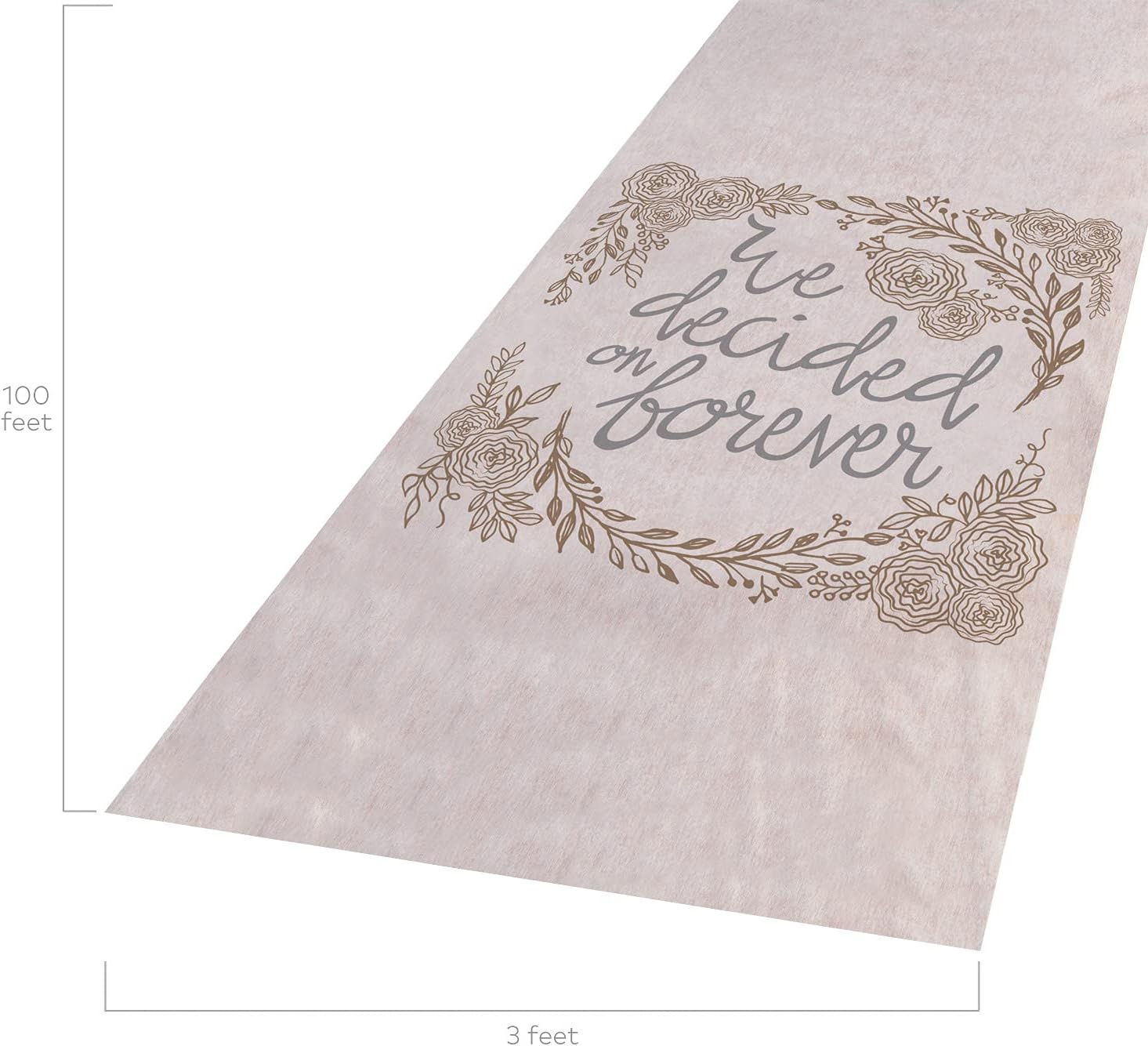 Add this beautiful aisle runner to your ceremony supplies for a simple yet elegant look! With floral accents and beautiful script, this aisle runner can work with any wedding color scheme or palette. From a rustic theme to a fairy tale theme, this runner will add a subtle elegance to your wedding supplies. Includes a nylon string roller. Polyester. 3 ft. x 100 ft. OTC