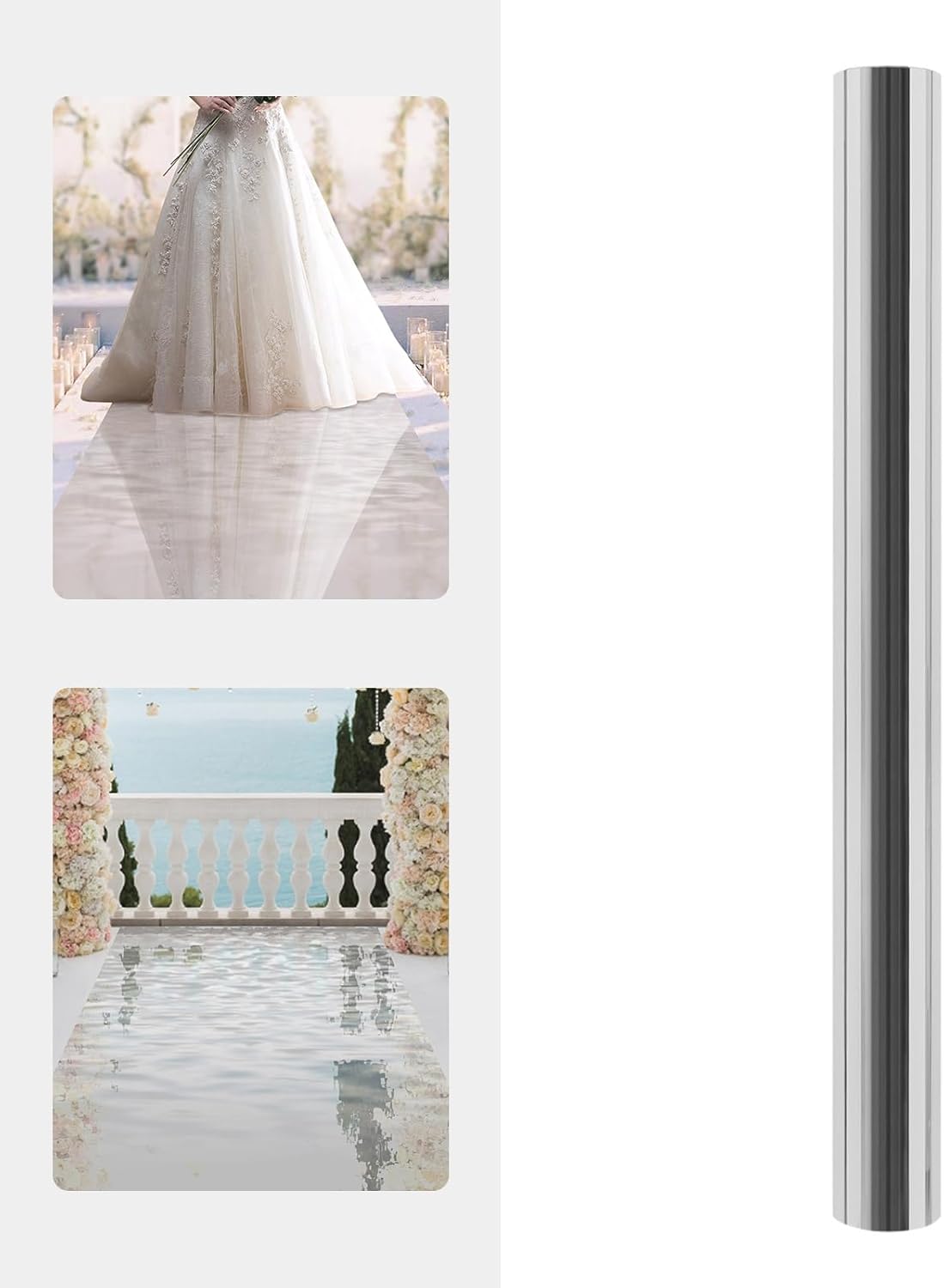 SpecificationsMaterial: PETColor: SilverStyle: Fashion, SimplePile Height: Low PileConstruction Type: Plastic Mirror Like Aisle RunnerThickness of Product: 0.12mm/0.005inchProduct Size: 19.8*0.9m/65*3ftPacking Size: 102*11*11cm/40.16*4.33*4.33inchGross Weight: 3kg/6.61lbsNet Weight: 2.9kg/6.39lbsPackage Included1*Mirror RugNotes1. Roll packing will cause this mirror rug to arrive slightly curled. Please do not worry about this.2. Please pay attention to scratch when unpacking and using.3. Please keep the product dry and keep it away from water or any humid place, otherwise, it will oxidize easily.