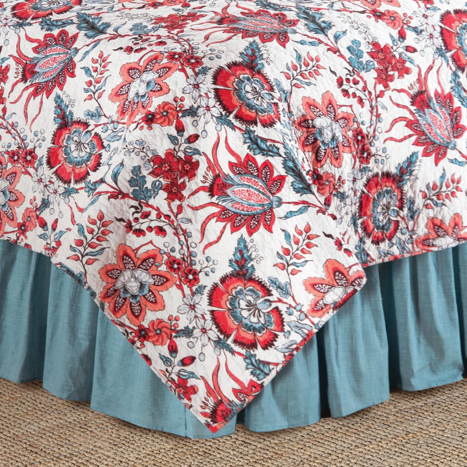 Inspired by an 18th Century imitation of imported Indian chintz as part of C&F Home's Williamsburg collaboration, this design featuring a vibrant floral damask pattern on a white ground is named in honor of Adrienne de Noailles de La Fayette. Adrienne's on-trend colorway of Aegean, Crimson, and Poppy caters to traditional and contemporary styles, alike. Switch to an alternate Aegean linen-look with just the flip of a quilt!