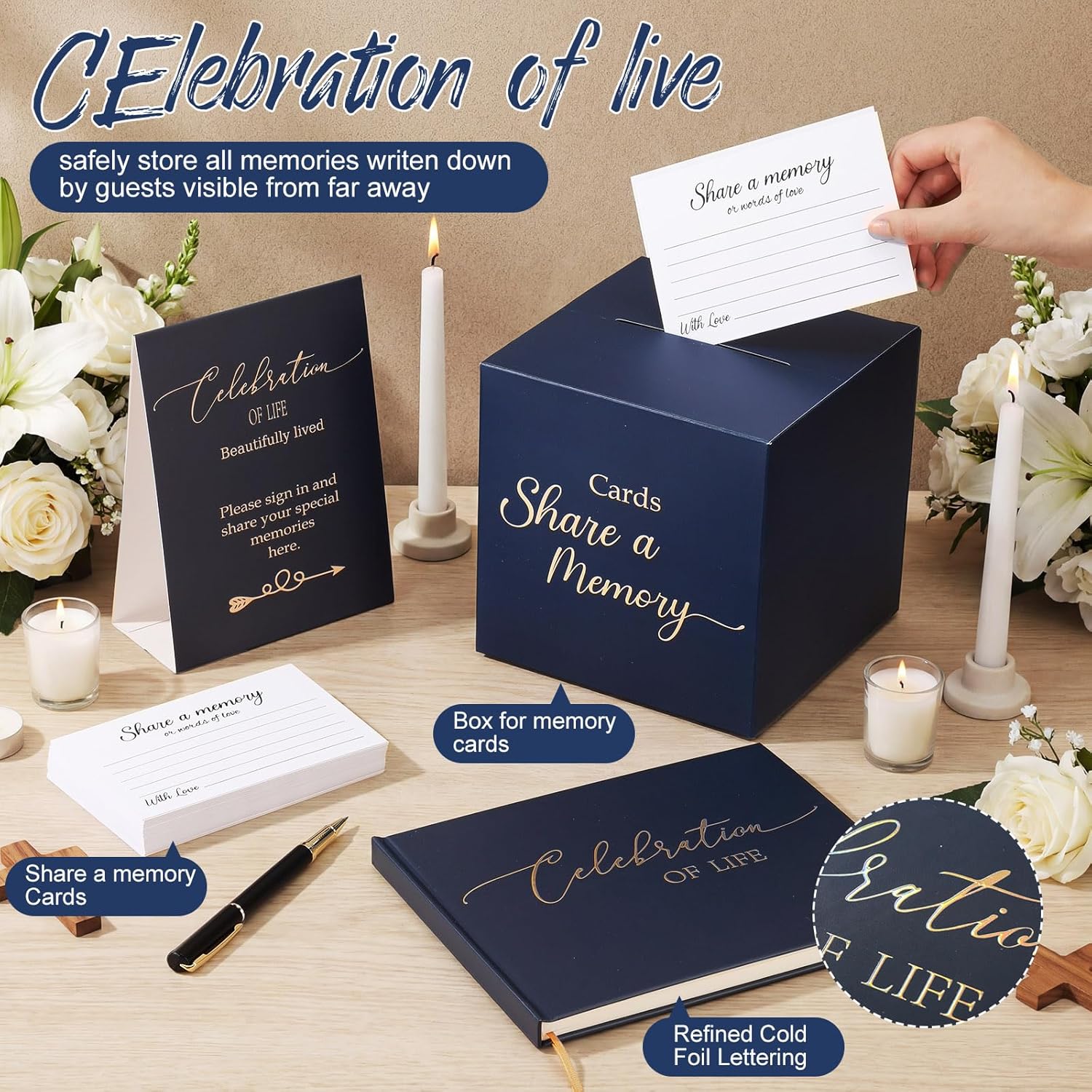 Features: Funeral guest book celebration life set is made of quality and sturdy materials, which is sturdy and thick to leave a lasting memory for your loved ones. Funeral book sign in set not only honors the life of a loved one but also provides a meaningful way to preserve memories. Specifications: Material: paper Color: blue and gold Size: guest book is 9.21x7.2inch Pen Ink: black Package includes: A funeral guest book A pen A table sign 60 Pcs Share Memory Cards and a Card Collection Box Notes: Manual measurement, please allow slight errors on size. The color may exist a slight difference due to different screen displays