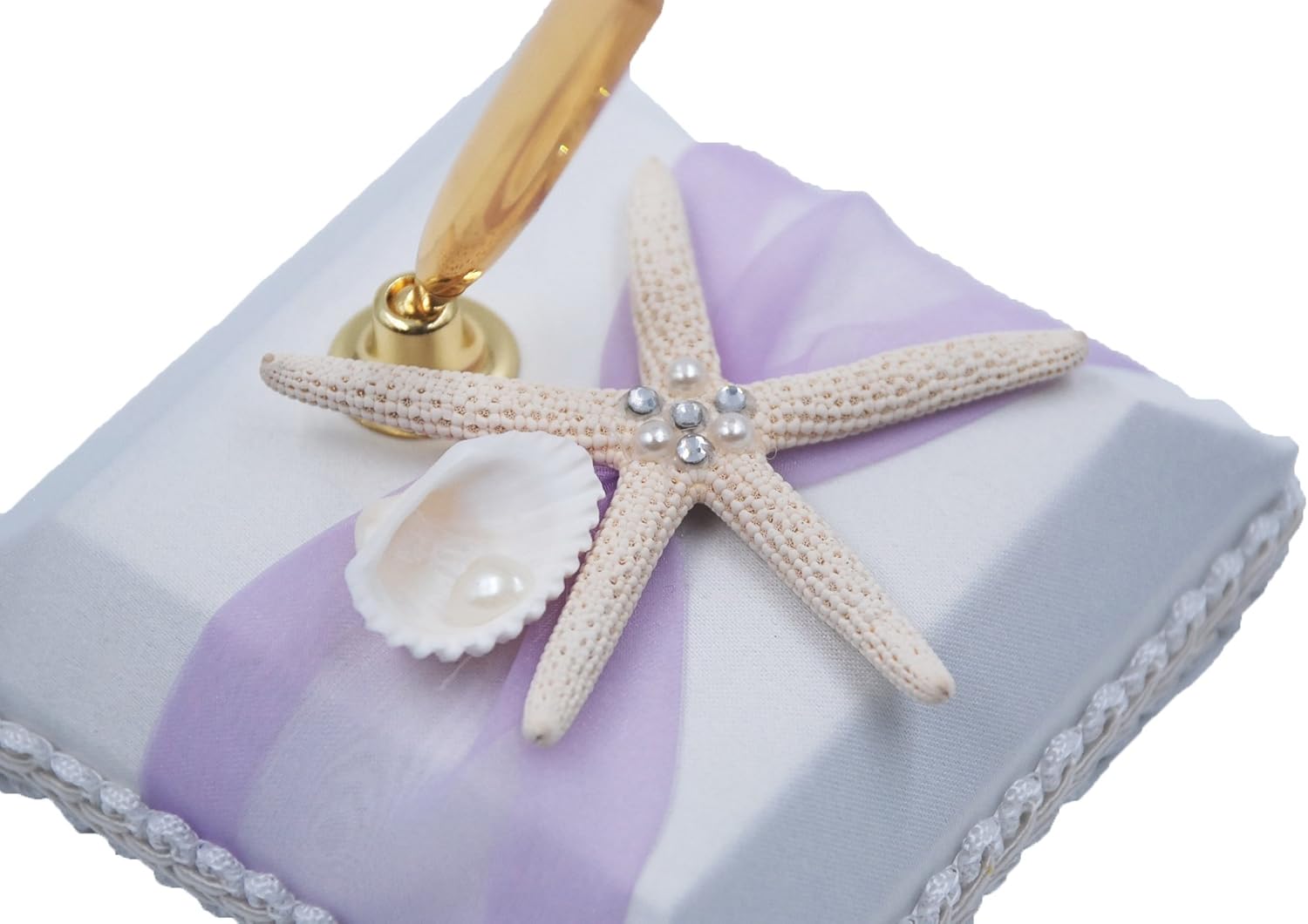 Specification: Dimension: Guest Book: 10" x 6.5" (L x W) Pen Set: 3.7" x 3.7" x 4" (L x W x H) Flower Basket: Diameter: 5.5" , Height with Handle: 9" Ring Pillow: 7" x 6" (L x W) Color: Light Purple, Light Blue, Orange( Peach) Fabric: Organza, Polyester, Foam, Shell, Paper Embellishment: Rhinestone, Organza, Sea Shell Packing List: 1 x Guest Book 1 x Pen Set (pen with pen stand) 1 x Flower Girl Basket 1 x Ring Pillow