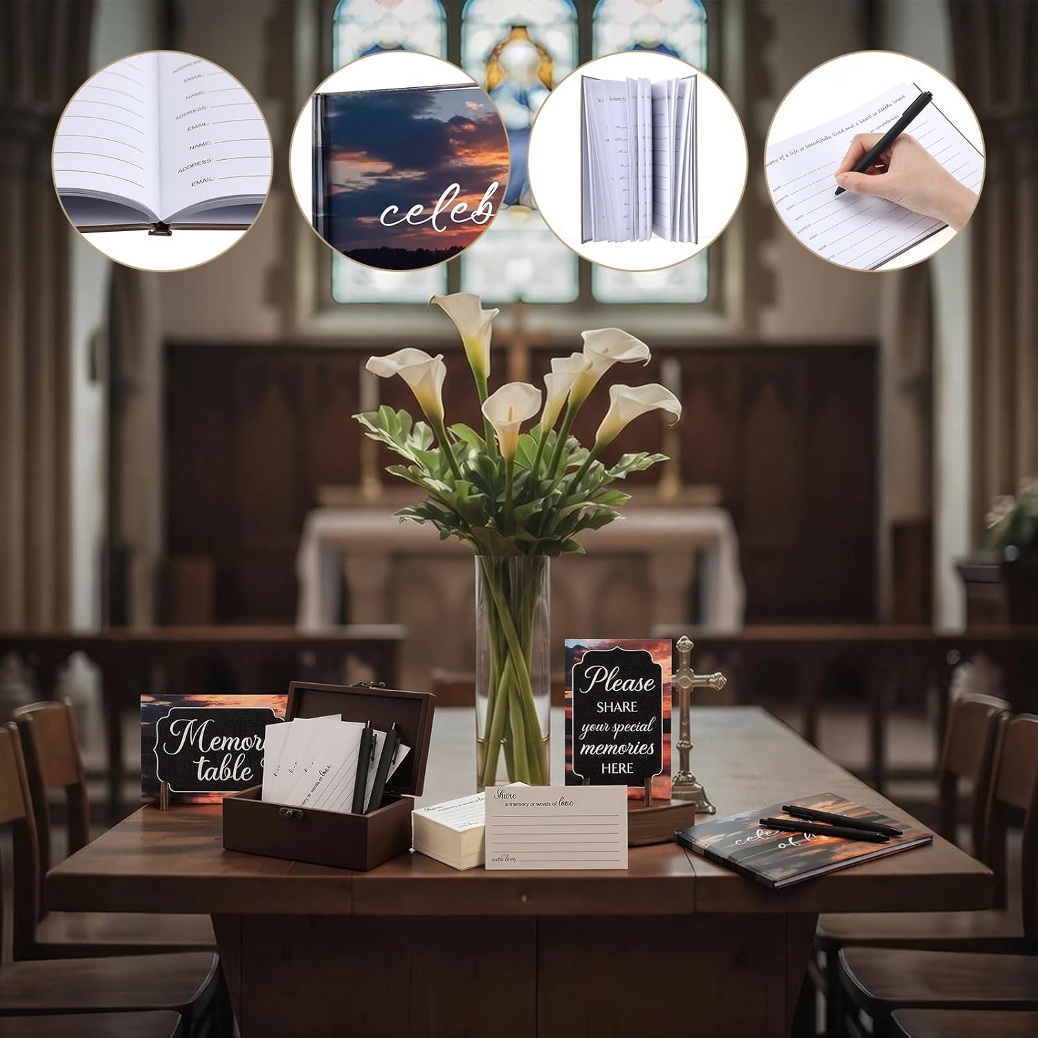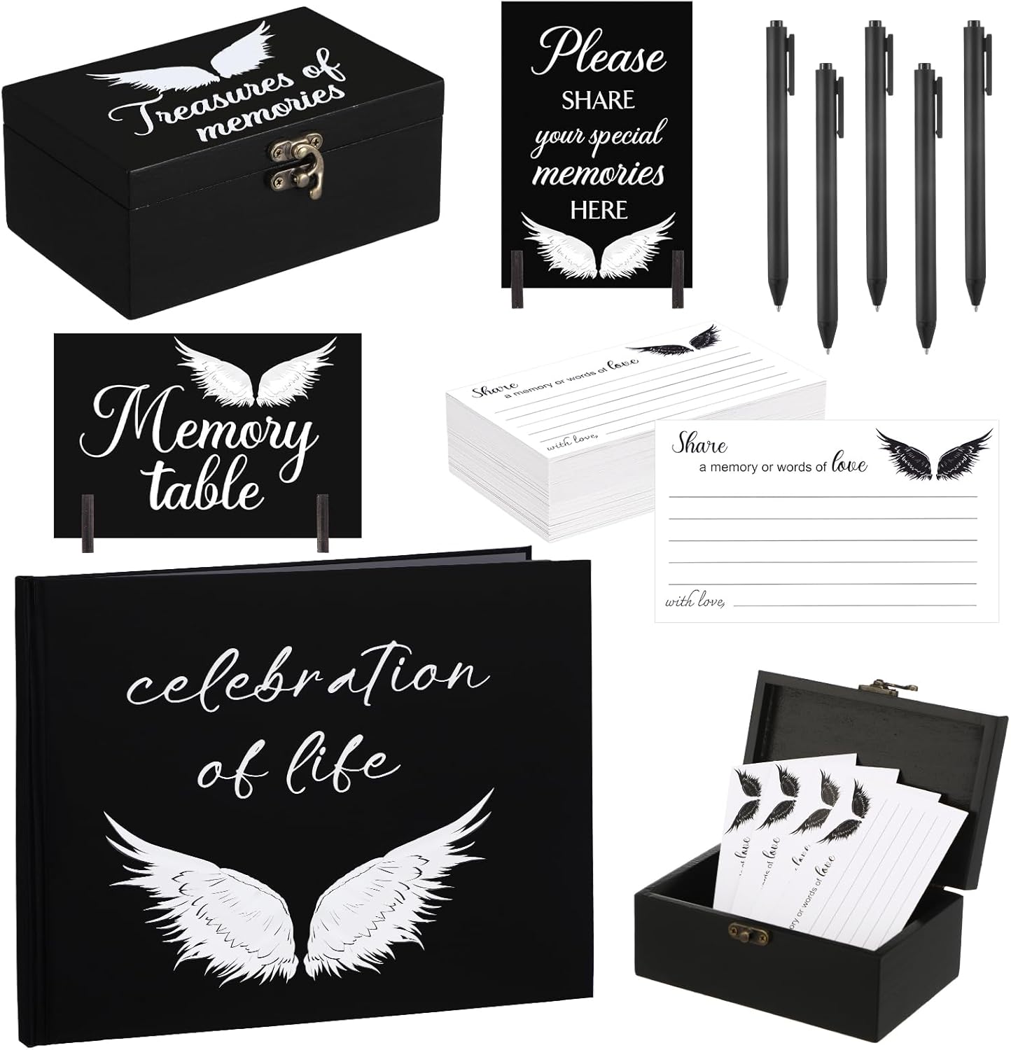 Features: The set's cohesive dusk and wood - tone design, paired with delicate "celebration of life", themed lettering and patterns, creates a warm yet dignified atmosphere for funeral settings. It allows friends and family to share memories and emotions in a comforting space that honors the while embracing the beauty of remembering a life nice lived. With the notebook's guided inner pages, encouraging heartfelt writing, and the wooden box's secure latch, safely storing all memory cards and keepsakes, this set is designed not just for funeral day use, but to become a long term "memory treasure box" for families. Years later, it remains a tangible way to revisit and cherish the moments of their loved one. Specifications: Material: wood, paper, plastic Color: multicolor Size: Card: 2.83 x 4.8 inches/ 7.2 x 12.2 cm(WxL) Wooden box: 5.51 x 3.54 x 6.3 inches/ 14 x 9 x 16 cm(LxWxH) Wooden standee: 4.72 x 3.15 inches/ 12 x 8 cm(LxW) Base: diameter about 1.57 inches/ 4 cm Book: 6.69 x 8.66 inches/ 17 x 22 cm(WxL) Package includes: 1 x Book, 100 x Cards 1 x Wooden box 2 x Wooden standees, 4 x Bases 5 x Pens Notes: Manual measurement, please allow slight errors on size. The color may exist a slight difference due to different screen displays