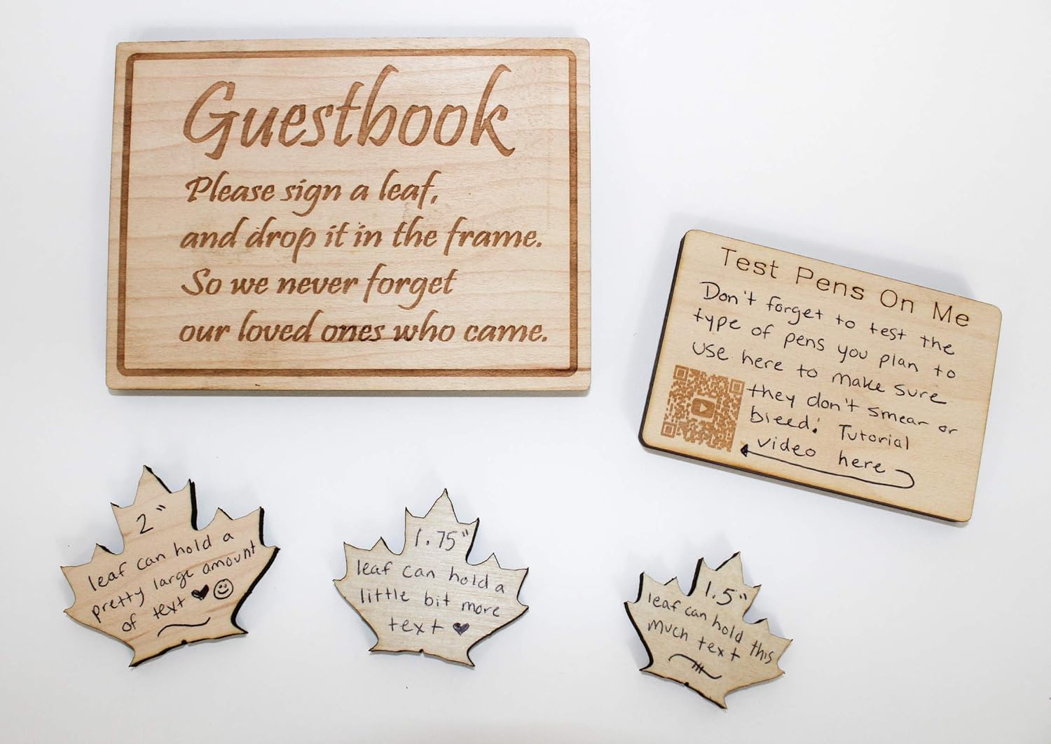 This unique and thoughtful guest book alternative is an exciting and warm way to involve guests at your event. They'll enjoy signing the wooden leaves and dropping them in the frame. It's not just a great wedding guest book, it's also perfect for baby showers, birthdays, Bar/Bat Mitzvahs, Fundraisers, etc. **There are different frame sizes and 3 different leaf sizes (1.5", 1.75", 2") to accommodate a range of event sizes. The larger the leaf, the more than can be written on them, but the less which will fit in a frame. --In my opinion...(see the picture above of the signed maple leaves) ---The 1.5" leaves are a good size for just a name or two, but not much more. ---The 1.75" leaves hold more text. A great size for multiple names (often the choice of signing by couples). Also a name with a longer blurb and/or small drawing. ---The 2" leaves have quite a bit of room and are great for allowing guests to leave a message. Remember, most guests at events like weddings will fill out one piece as a pair if they're with a date. So if you plan to have 150 guests at your wedding, unless you make it a point that each guest sign a piece individually, expect less than 150 signed pieces. Therefore, I'd suggest 1.75" or 2" leaves with a frame which will hold 100-125 pieces. For something like a kid's birthday, I suggest getting the smaller or medium sized leaves (1.5" or 1.75") and close to around exactly how many guests you plan to have. Each kid will want to sign his own. ***The frame sizes, and approximate amount of each leaf size that frame will hold are as follows: *[]* 8"x 10" ~ 40 1.5" leaves, ~30 1.75" leaves, ~20 2" leaves *[]* 11" x 14" ~ 70 1.5" leaves, ~55 1.75" leaves, ~35 2" leaves *[]* 14" x 16" ~ 115 1.5" leaves, ~90 1.75" leaves, ~60 2" leaves *[]* 16" x 20" ~ 160 1.5" leaves, ~125 1.75" leaves, ~85 2" leaves *[]* 18" x 24" ~ 205 1.5" leaves, ~165 1.75" leaves, ~110 2" leaves