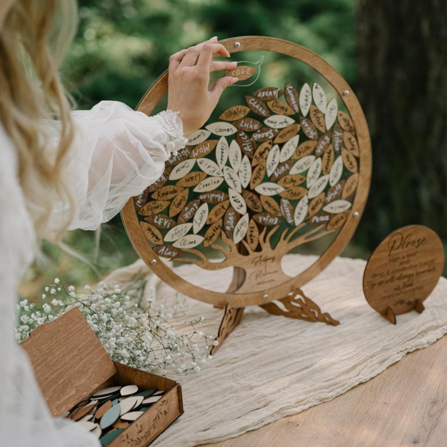 We are happy to share the warm moments of your Wedding Day with you! Surprise your guests our Custom Wedding Guest Book Alternative! This gorgeous circle frame can house every wish and blessing that your guests bestow upon your union. All they have to do is write everything down on small wooden leaf, sign their wishes, and drop the leaf inside the frame. Each order includes: - guest book;(tree leaves for guests) - wooden stand; - wooden sign - Wooden box for storing tree leaves TECHNICAL DETAILS The Size of Guest Book depends on the number of leaves : 25 Leaves : - 9.8 inches (25cm) in the diameter. 50 Leaves : - 12 inches (30cm) in the diameter. 90 Leaves : - 16 inches (40cm) in the diameter. 120 Leaves : - 18 inches (45cm) in the diameter. 150 Leaves : - 20 inches (50cm) in the diameter. 180 Leaves : - 22 inches (55cm) in the diameter. The size of Box for Leaves depends on the number of Leaves. Size of leaf: 3 cm (1.18 inch) Every Guest Book is handmade with great care by our craftsmen from high-quality plywood. Personalization is achieved by using the state of the art laser cutting. We recommend this variant for aesthetic lovers, for young marrieds with exceptional taste. You will enjoy this lovely decoration every day. A stylish frame will suit any interior.