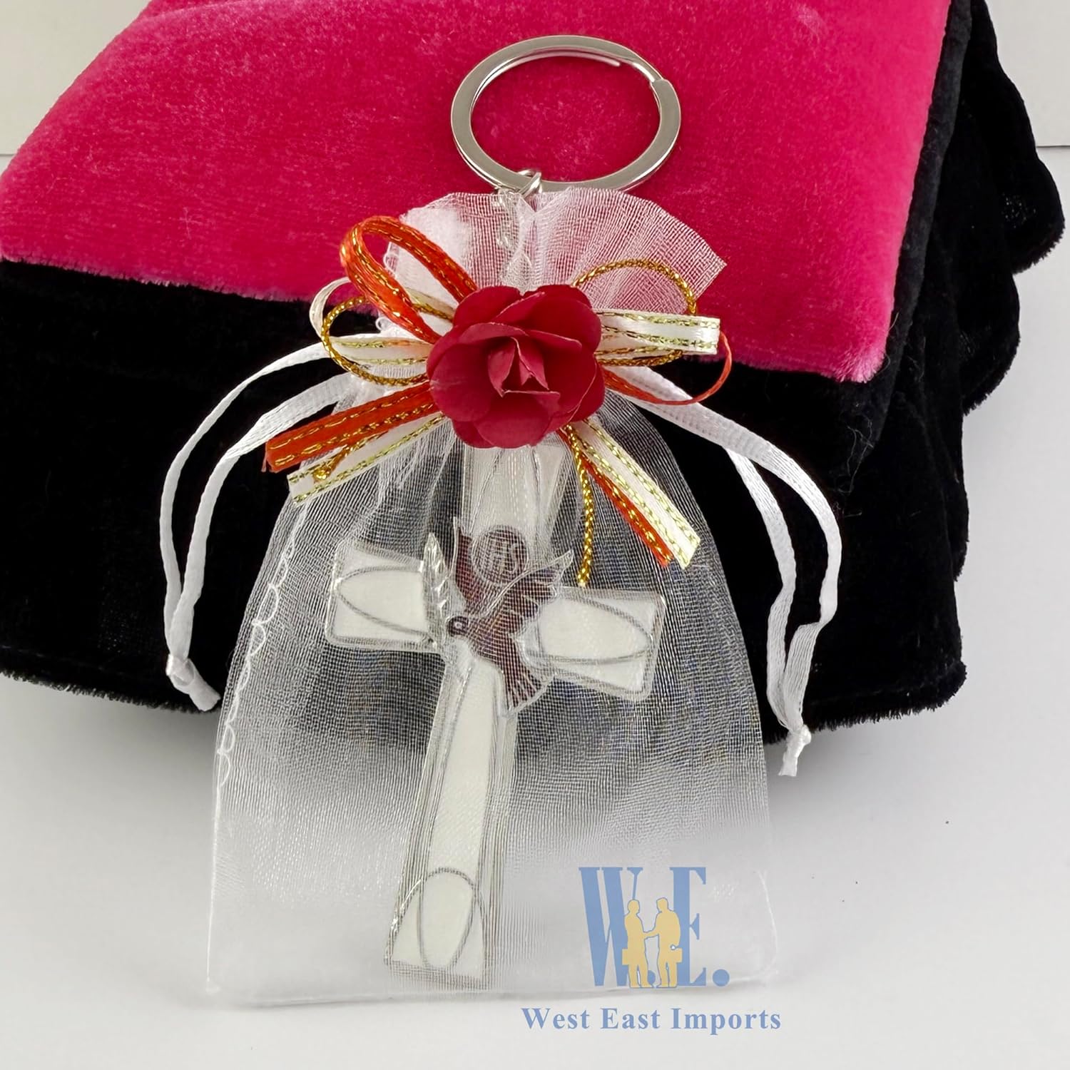 12 Pcs Holy Spirit Confirmation Cross Key Chain. Each red cross with a white dove keychain comes in a decorated organza bag. A meaningful and useful favor for Confirmations and Christian events. Your guests will be overjoyed to received these beautiful cross dove keychain