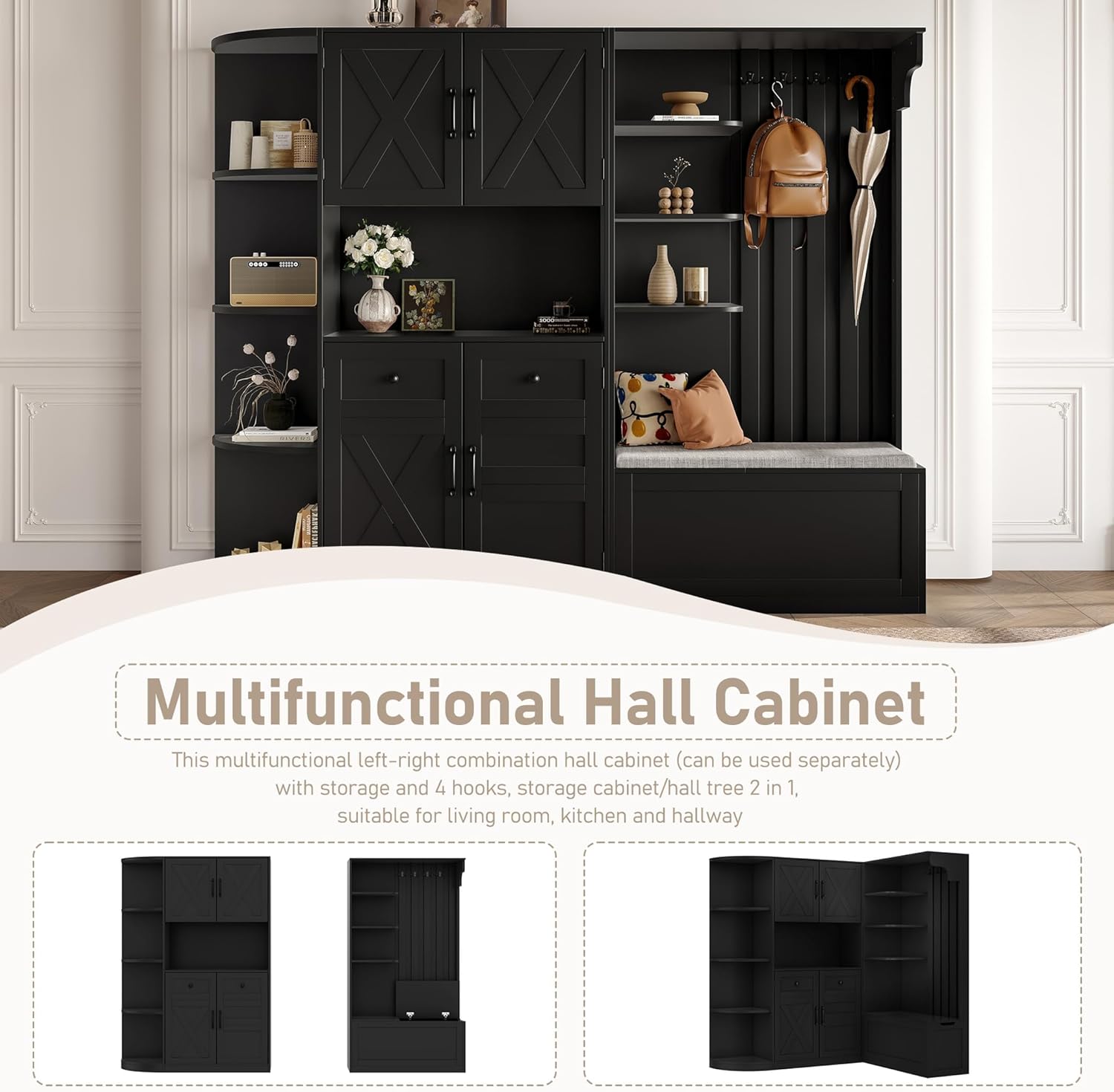 This black hall tree with bench and shoe storage features a versatile left-right combination design, allowing independent or L-shaped use to maximize corner space. Crafted from durable MDF and particle board, this mudroom bench with storage and hooks offers 8 shelves, 5 cabinets, and 4 hooks to neatly organize shoes, bags, and household items. Its round-corner design ensures safety, while the flip-open compartments provide convenient seating for shoe changing. Ideal for hallways, entryways, living rooms, and kitchens, this hall tree with bench and storage brings both functionality and modern elegance to any home. Dimensions: 74.80"L x 12.60"W x 65.90"H, supporting up to 40 lbs per shelf.