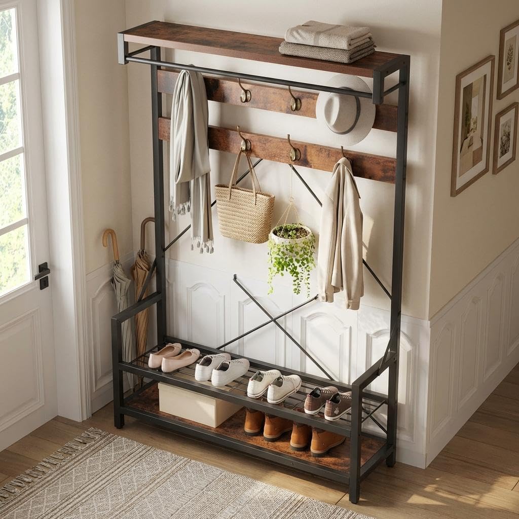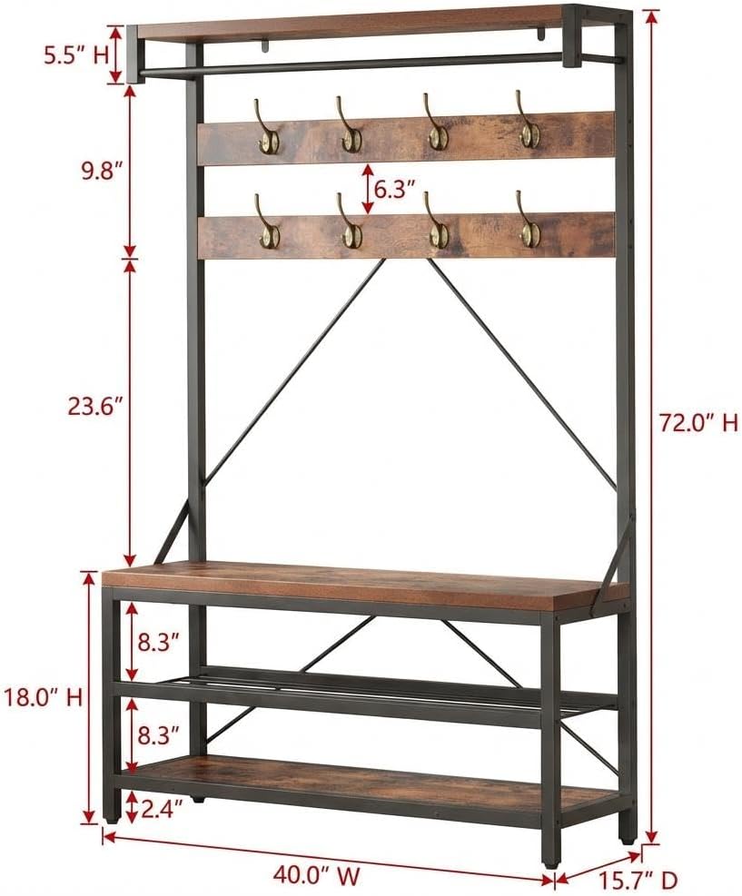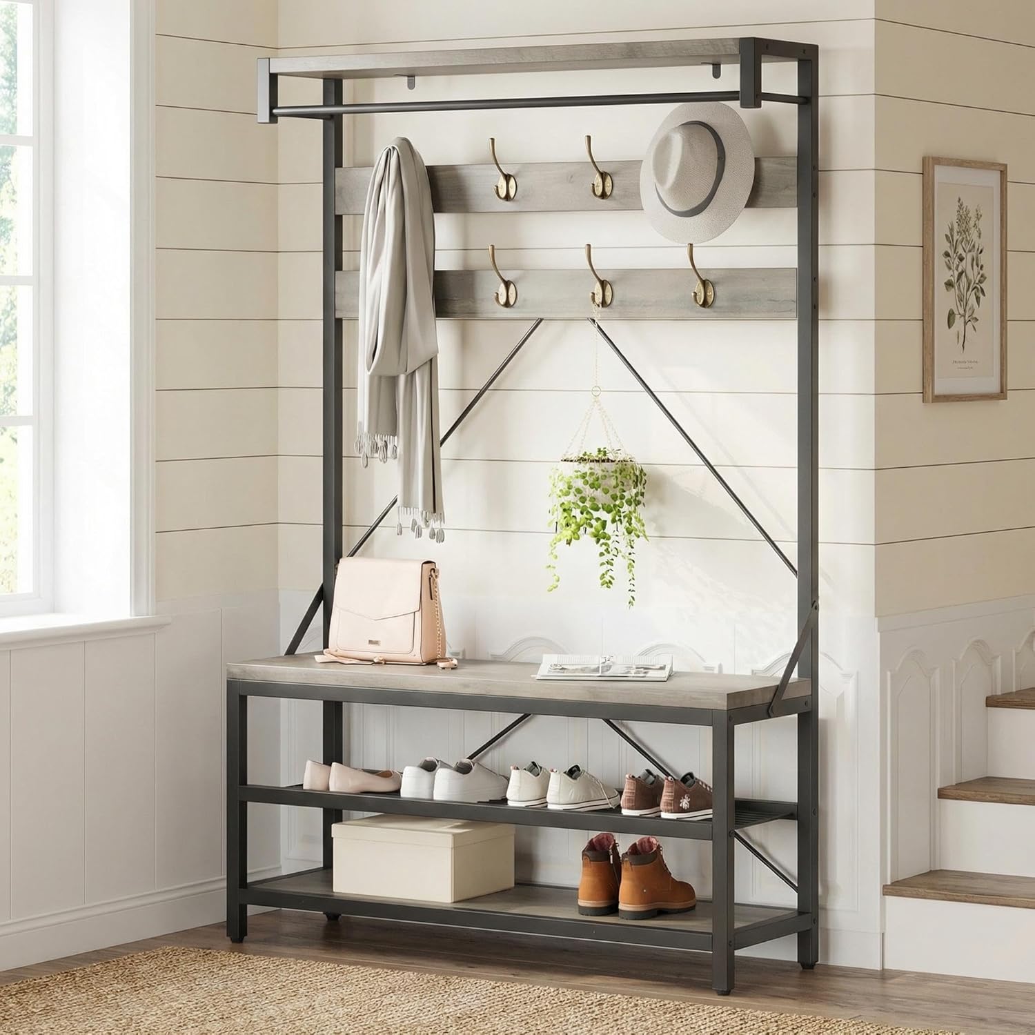 72" Industrial Hall Tree Entryway Bench, Wooden Coat Rack Shoe BenchReimagine your entryway as a functional and stylish welcome. This industrial hall tree combines robust construction and sleek design into a comprehensive storage system, transforming high-traffic zones into models of order and contemporary charm.Key Highlights:Robust, Reliable Build: Crafted from superior engineered wood and a reinforced metal frame for lasting stability. The sturdy bench supports up to 300 lbs, offering a dependable spot for putting on shoes while withstanding daily family use.Sleek Modern Industrial Aesthetic: Features a sleek metal structure paired with a warm wood-grain finish. This clean, contemporary industrial design seamlessly complements modern, farmhouse, or transitional decor, adding stylish function to any space.Storage Command Center: This 72-inch unit consolidates everything you need: a sturdy coat rack with 8 hooks, a hanging bar for longer items, a 2-tier shoe bench, and a top shelf. Efficiently organize shoes, jackets, bags, and daily essentials in one unified, clutter-free station.Versatile for Any High-Traffic Area: Perfectly adaptable for entryways, mudrooms, bedrooms, or home offices. Its modular footprint fits neatly into corners or along walls, providing a flexible storage solution that keeps busy households tidy and streamlined.Quick & Straightforward Assembly: Designed for ease with clear instructions and all hardware included. Assemble your hall tree quickly and effortlessly, ready to organize and enhance your space in no time.