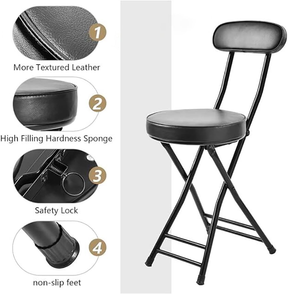 Folding seat is suitable for all narrow spaces such as apartments, RVs, studios, etc.Upholstered seats can be widely used for dining tables, dressers, home bars, balconies, lofts, etc.Highlights of the Folding Stool with Upholstered Seat1. Safety lock ensures stability2. Foldable to save valuable space3. Easy to carry after folding4.PU synthetic leather and steel tube is easy to clean5.Cushion provides comfortable sitting experience6.No assembly required - save your time and energyBasic SpecificationsColor: BlackMaterial: PU + soft foam + steel tubeSize:Seat height: 18 inchesSeat Diameter: 12 inchesCushion thickness: 1.6 inchesSeat opening height: 30 inchesWeight capacity: 260 lbsPackage Contents:1x Folding StoolSize is measured manually, there is 0.1-0.3" error, hope to get your understanding!