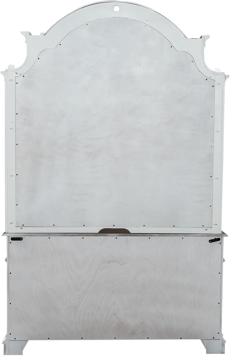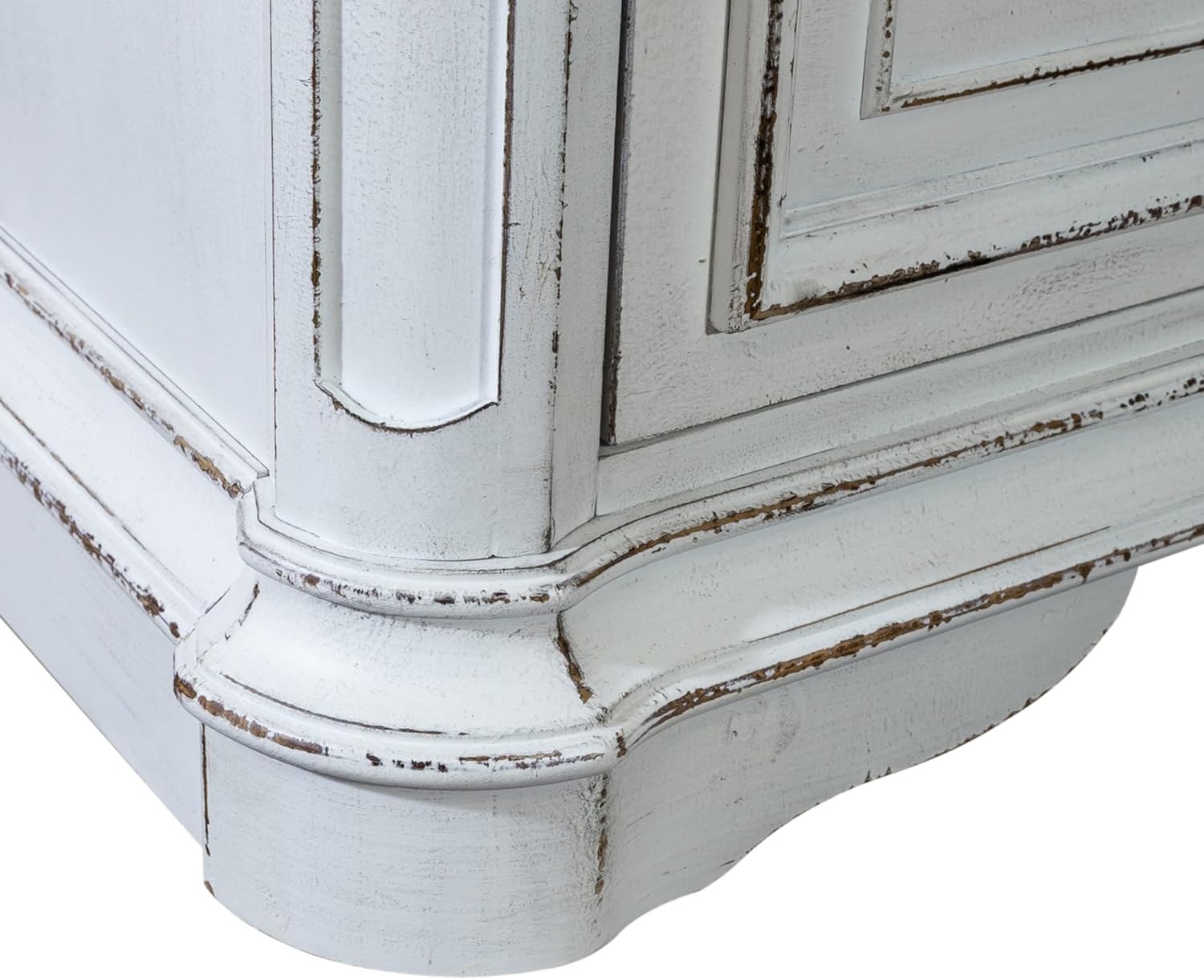 Blend European influences to create the Magnolia Manor credenza and hutch. Crafted with poplar and rubberwood solids with white oak and birch veneers, this piece features framed drawer fronts accented by antique pewter hardware, two large file drawers that can be locked, an open display for storage illuminated by touch lighting, and a flip-down keyboard tray. With today's modern technology in mind, users can enjoy the convenience of the built-in wire management provisions, two outlet ports, and two USB ports. The planked back panel flows throughout the hutch, even behind the two doors where adjustable shelving is located. Warm antique finishes and artistic distressing along with grand scale a group to be passed to generations.