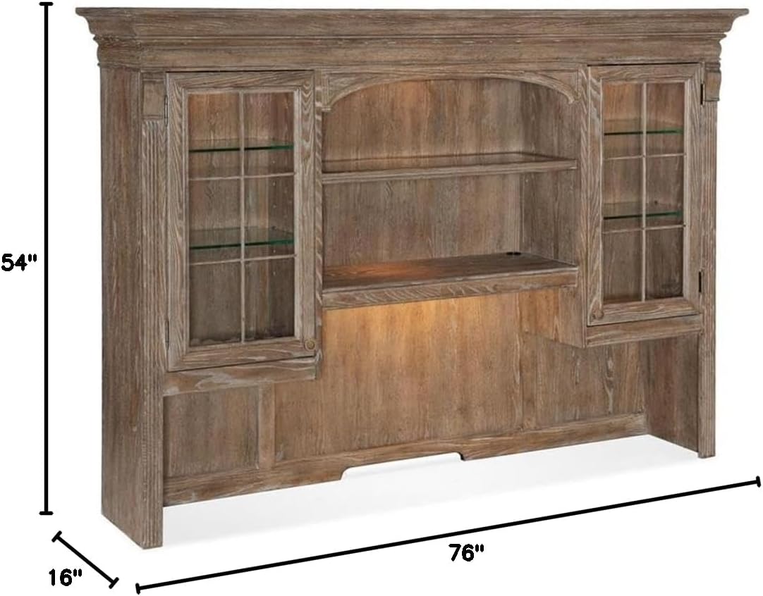 Traditional with a twist, the Credenza Hutch is crafted of Cathedral Oak Veneers with a classic silhouette and quality designer details such as a crown molding across the top paired with the casual clear Claro finish with champagne-colored pulls. Two wood-framed doors with two adjustable shelves behind each and one adjustable wood-framed glass shelf and one fixed shelf in the center area. There’s a task light in the monitor area and 3 puck lights at the top, one in each section.Features:- Two wood-framed glass doors with two adjustable shelves behind each- One adjustable wood-framed glass shelf and one fixed shelf in center area- Task light in monitor area- Three puck lights at the top, one in each section