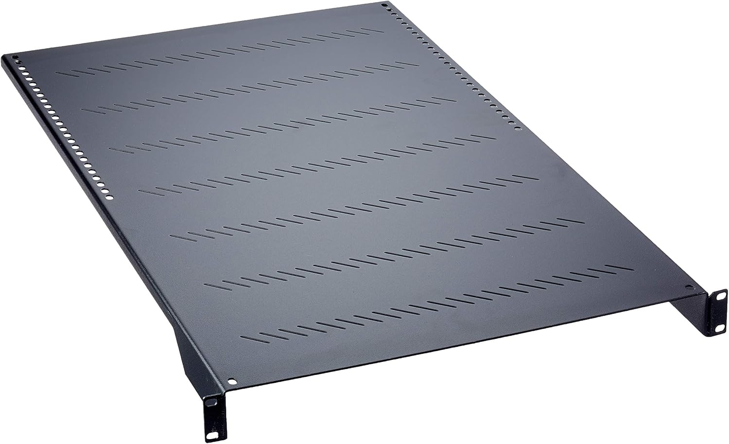 48.26 cm (19 inch) shelf, perforated, 1U, colour: black, depth 750 mm, load 40 kg, attachment to front and rear 48.26 cm (19 inch) profile rail, firmly mounted shelf, accessory: 8 screws M6x10, 8 plastic washers, 8 cage nuts M6, 4 screws M5x12, 2x rear mount 2x