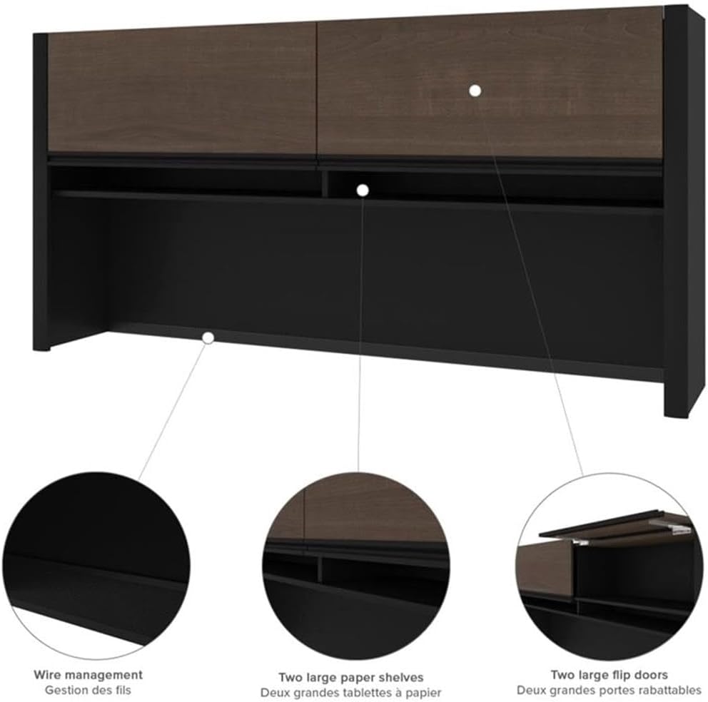 The hutch for credenza desk offers large closed storage space, efficient wire management, and two large paper shelves.Features:- Finish: Antigua and Black- Material: High-density Commercial Grade Particle Board- It offers large closed storage space, efficient wire management and two large paper shelves- The doors are fitted with strong lift up hardware- The large flip-up doors bring a modern and original touch- This unit must sit on the Connexion credenzaSpecifications:- Product Dimensions: 35.5" H x 70.6" W x 13.4" D- Product Weight: 105 lbs- Number of Doors: 2- Number of Shelves: 2
