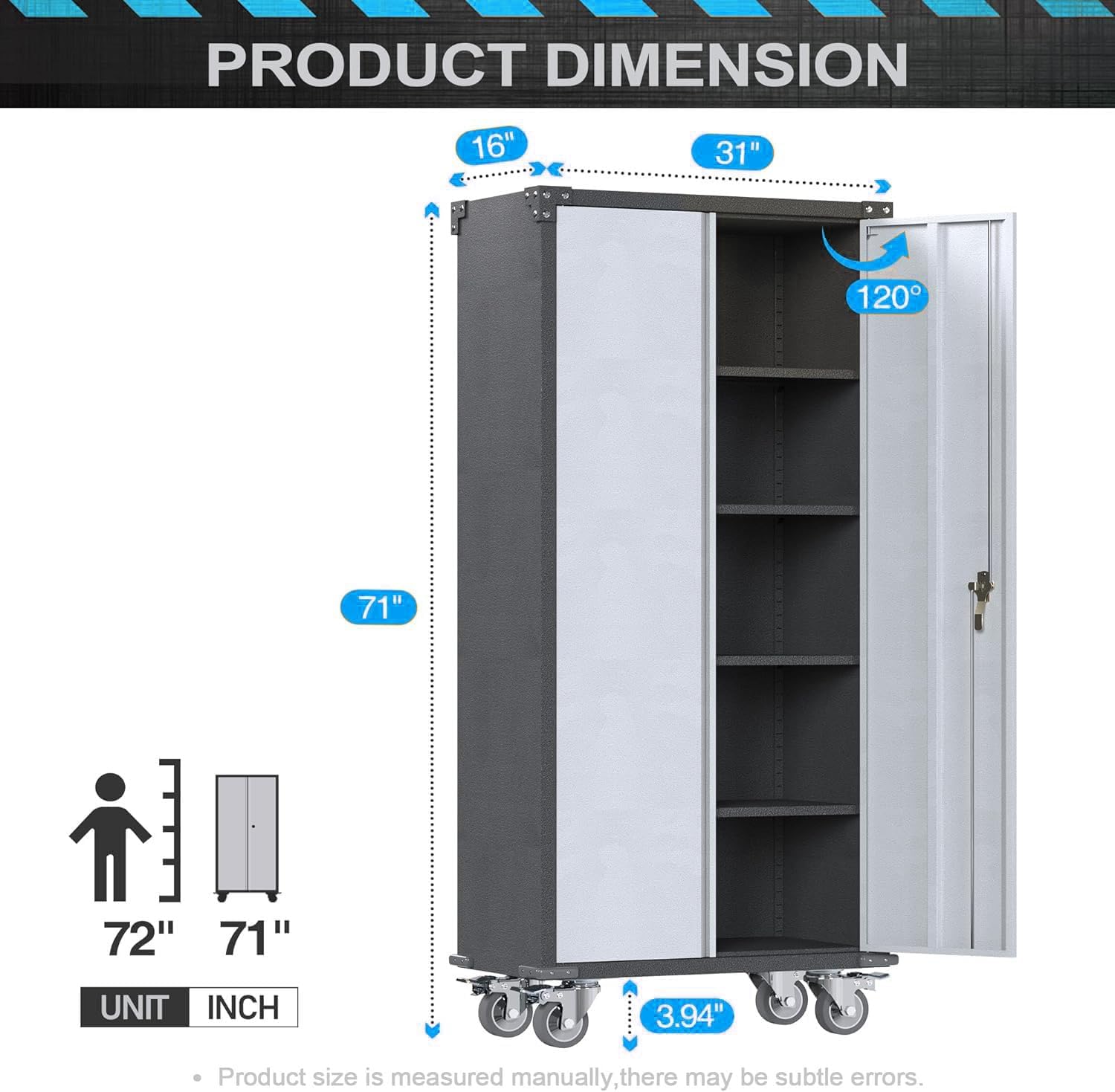 | Included Components | Shelves (4 adjustable), Cabinet body, Locking doors (2), Casters lockable), Handles Assembly instructions |