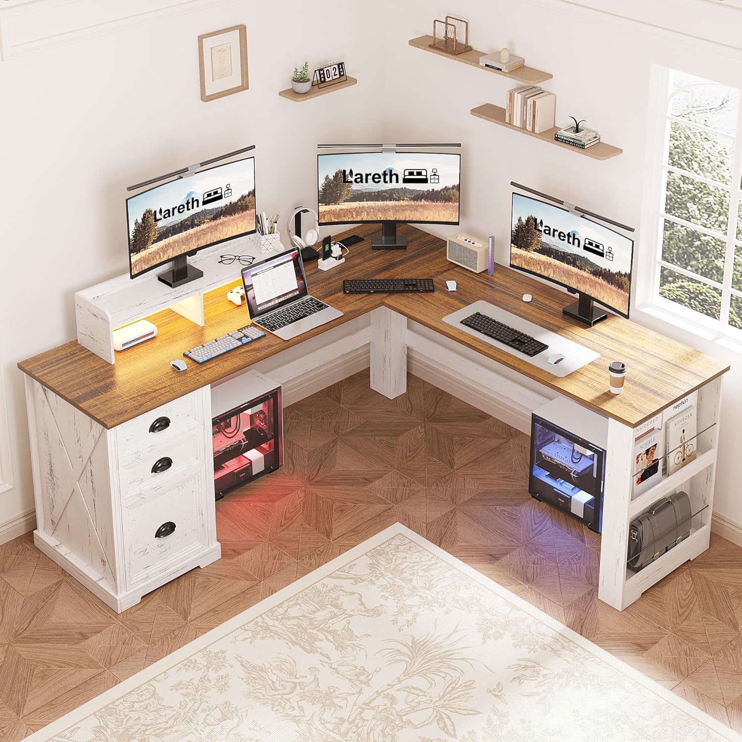 | Storage Options | 1 file cabinet, 2 drawers, 2 open shelves |