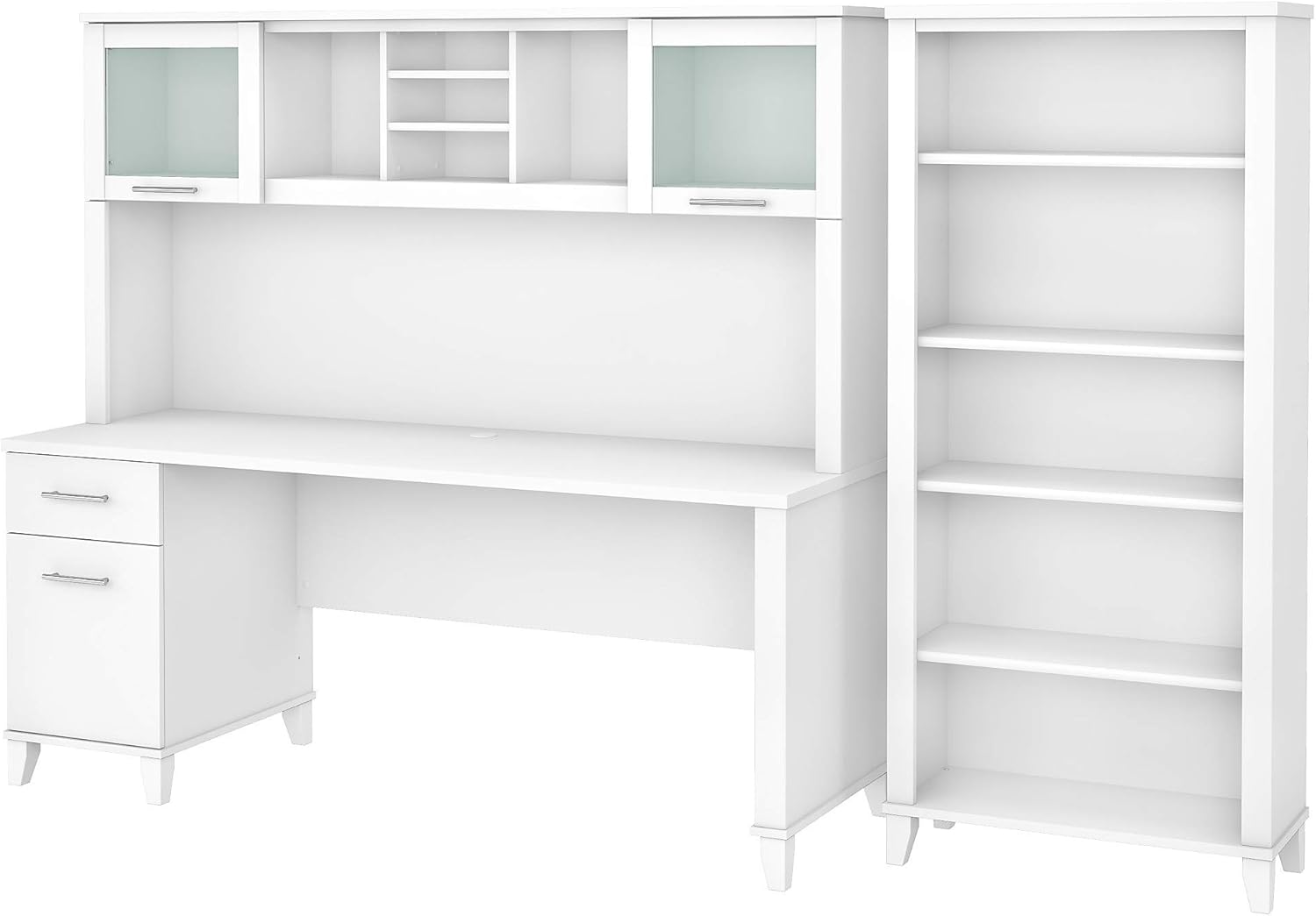 A spacious work surface and plenty of storage capacity make the Bush Furniture Somerset 72W office desk with hutch and 5 shelf bookcase a perfect choice for your home office. Spread out with a computer and paperwork while multitasking on an expansive desktop that includes a convenient wire management grommet to keep cords and cables in order. The Desk's file drawer opens on full-extension ball bearing slides for easy access to legal and letter size documents, while a box drawer keeps the office supplies and utensils you need close by. The hutch attaches to the desktop and adds a pair of lift-up frosted glass doors for concealed storage in addition to open cubby spaces with 2 adjustable shelves for storage of books, binders, decorations and more. The bookcase features 2 fixed shelves for stability and 3 adjustable shelves to accommodate items of various sizes. Somerset's transitional styling includes your choice of attractive mocha cherry, Hansen Cherry, maple cross and ash gray finishes with tapered leg accents and contemporary metal hardware for an appealing look that works with virtually any decor. The 72W x 24D computer desk can also be used with the coordinating Somerset 42W 3 position sit to stand return (sold separately) to create an ergonomic Height adjustable workspace. The office desk with hutch and bookshelf set is tested to meet ANSI/Soho quality standards for safety and performance and is backed by the Bush Furniture 6 year manufacturer's .