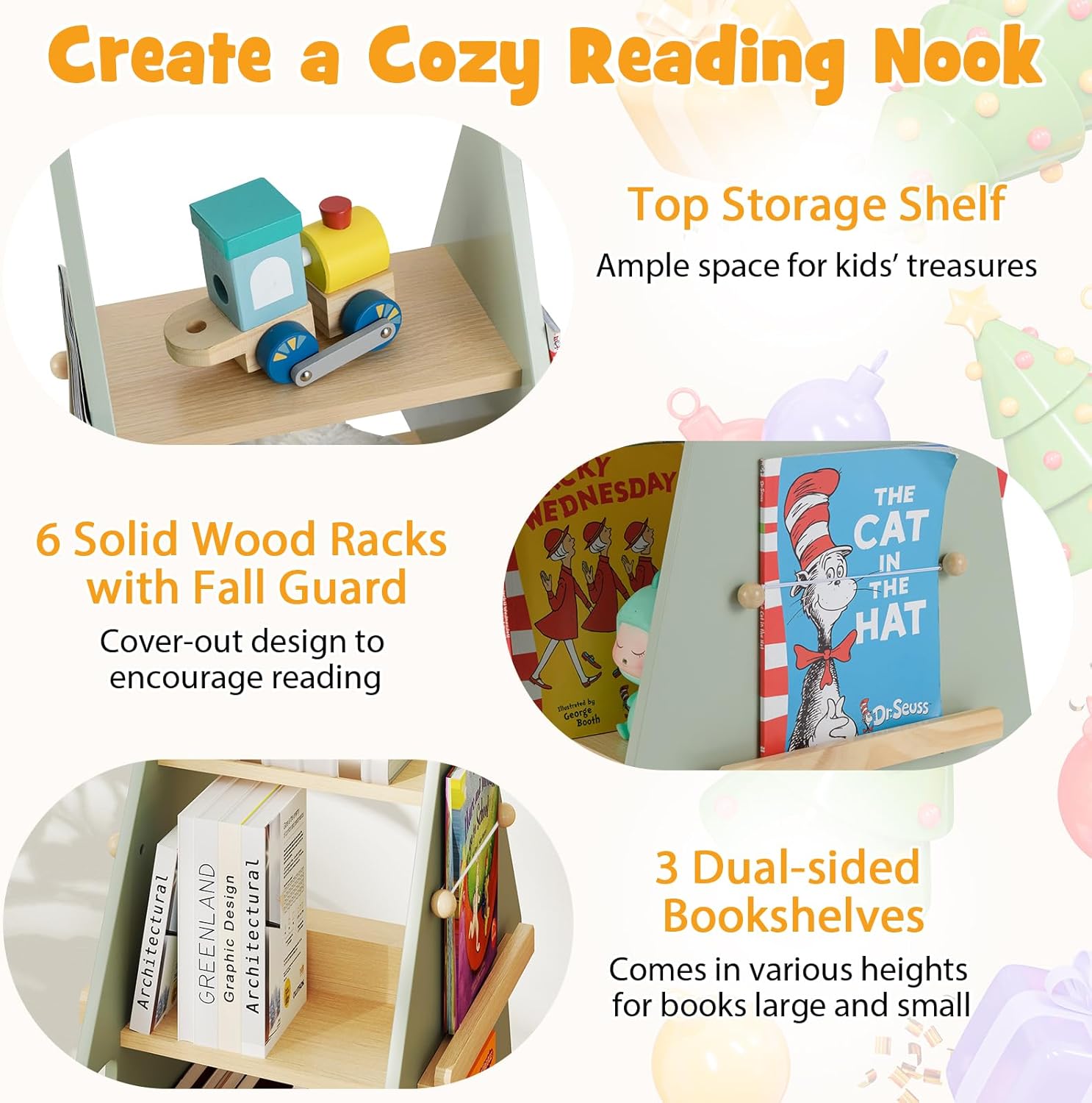 Description:Create a cozy reading nook for your little ones with our kids rotating bookshelf! Designed to fit perfectly into corners, this space-saving 360° rotating bookshelf offers 4 tiers of vertical storage—from toy-packed tops to side racks that display colorful covers, turning any space into a delightful mini library. The smooth ball-bearing rotation allows easy access for little hands, while rounded edges ensure safety as children dive into their favorite stories. Adorned in gentle pastel hues and designed with a whimsical tree shape, the bookshelf add a touch of creativity, sparking joy as children pick out books and parents recount nighttime stories. More than storage, it's a cozy hub where curiosity grows and family moments blossom page by page!Feature:Top storage shelf for toys, decorations and photo frames3 dual-sided shelves come in various heights for books large and small6 solid wood racks with cover-out design to encourage readingFall guard over each rack keep books in place when spinning360° smooth rotation with built-in ball bearingIdeal for room corners and small spaces with its vertical layoutCute tree-shaped design fills kid's room or nursery with creativityPerfect height for little readers to select booksASTM and CPSIA compliant for parent's peace of mindAssembly neededSpecifications:Color: Green + NaturalMaterial: Pine Wood, MDFOverall Dimensions: 19" x 19" x 40" (L x W x H)Net Weight: 24 lbsWeight Capacity: 44 lbsPackage Includes:1 x Kids Rotating Bookshelf1 x Instruction