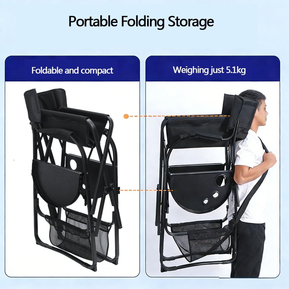 This board chair is sturdy and long-lasting. Product finishes are luxurious. Heat cured, powder coated aircraft aluminum frame. Foldable, portable and lightweight.Sturdy aluminum frame and 600D polyester fabric. No assembly required and folds quickly for easy storage and portability.Relaxing padded armrest design and reversible cell phone side table. Camping with your lovely family or cherished friends.Specification:Material: aluminum alloy + oxford fabricHeight: 116 cm/45.67 inchesSeat depth: 41 cm/16.14 inchesOverall chair size (L x W x H): 63 x 56 x 116 cm/24.8 x 22.05 x 45.67 inchesNet weight of chair:5.1 kg/11.24 lbsSuitable occasions : camping, indoor, patio, beach, picnic, fishing, garden, make-up, exhibition, auditorium and other spacesPackage Includes :1 x double side table makeup chair1 x Cosmetic Brush Bag1 x Chair with shoulder strap2 x Cup Sleeves1 x Portable bagAFTER-SALES SERVICE: we will provide you with excellent after-sales service. If you have any questions about our products or services, please leave us a message. We will try our best to solve any problem.