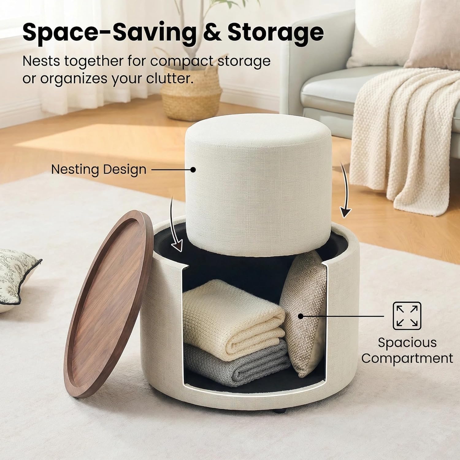 Transform your living space with this versatile 2-piece nesting ottoman set that offers 4-in-1 functionality. The larger ottoman measures 22.75" in diameter and 15" in height, while the smaller piece nests perfectly inside for space-saving storage. Each piece features elegant linen upholstery in a sophisticated beige tone, complemented by removable wooden trays that convert them into convenient coffee tables. The spacious hidden storage compartment is perfect for blankets, pillows, or other living room essentials. Use them as footrests, extra seating, coffee tables, or storage solutions - their round design and neutral color scheme blend seamlessly with any decor style. The nesting feature allows for compact storage when not in use, making this set ideal for apartments or rooms where space is at a premium. The sturdy construction and practical design make these ottomans both functional and stylish additions to your home.
