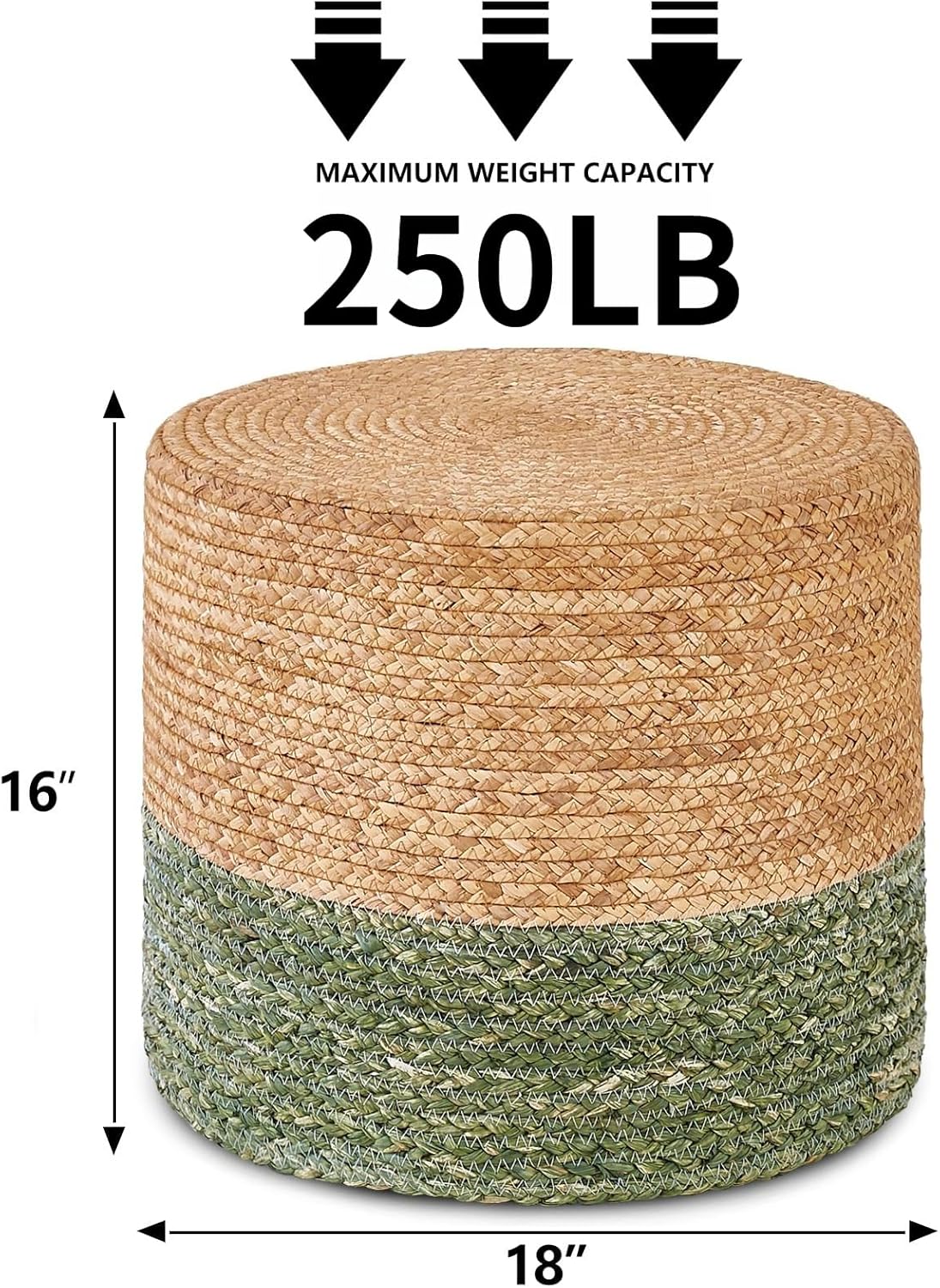 Handcrafted Natural Charm Expertly handwoven from thick, sustainable natural cattail, this pouf ottoman combines durability with lightweight design. Easy to move, yet sturdy and comfortable for everyday use. Versatile Multi-Purpose Use Perfect as a vanity stool, extra seat, shoe-changing bench, or a cozy footrest. It also works beautifully as a balcony or garden accent, or even as a stylish side or coffee table. Stylish & Natural Home Accent Crafted with natural jute fibers for a warm, organic texture that blends effortlessly with modern, coastal, farmhouse, or boho interiors. Each piece is uniquely charming. Stable, Durable & Comfortable Built to support up to 350 lbs. with four anti-slip rubber pads for enhanced stability. The thick, cushioned seat ensures long-lasting comfort and everyday reliability. Low-Maintenance & Easy to Clean Simply spot-clean with a dry cloth and vacuum regularly to maintain its beauty. Designed for hassle-free care in busy households. Product Specifications: Weight Capacity: 250 pounds Package Include: 1 x Hand Weaving Ottoman
