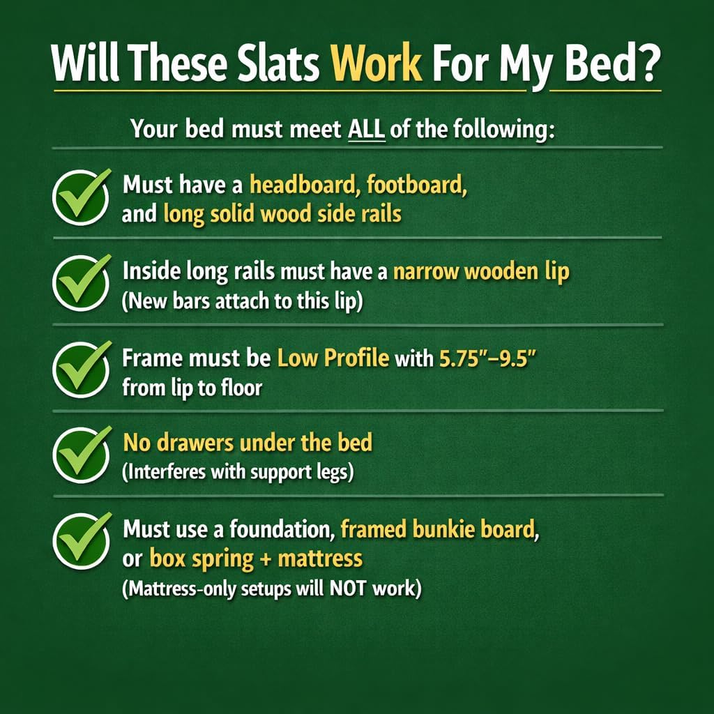 | Other Special Features of the Product | Adjustable, Heavy duty, Low Profile - Lip height 5.75" to 9.5 inches, Made in the USA, Works with wooden headboards, footboards, and side rails only |