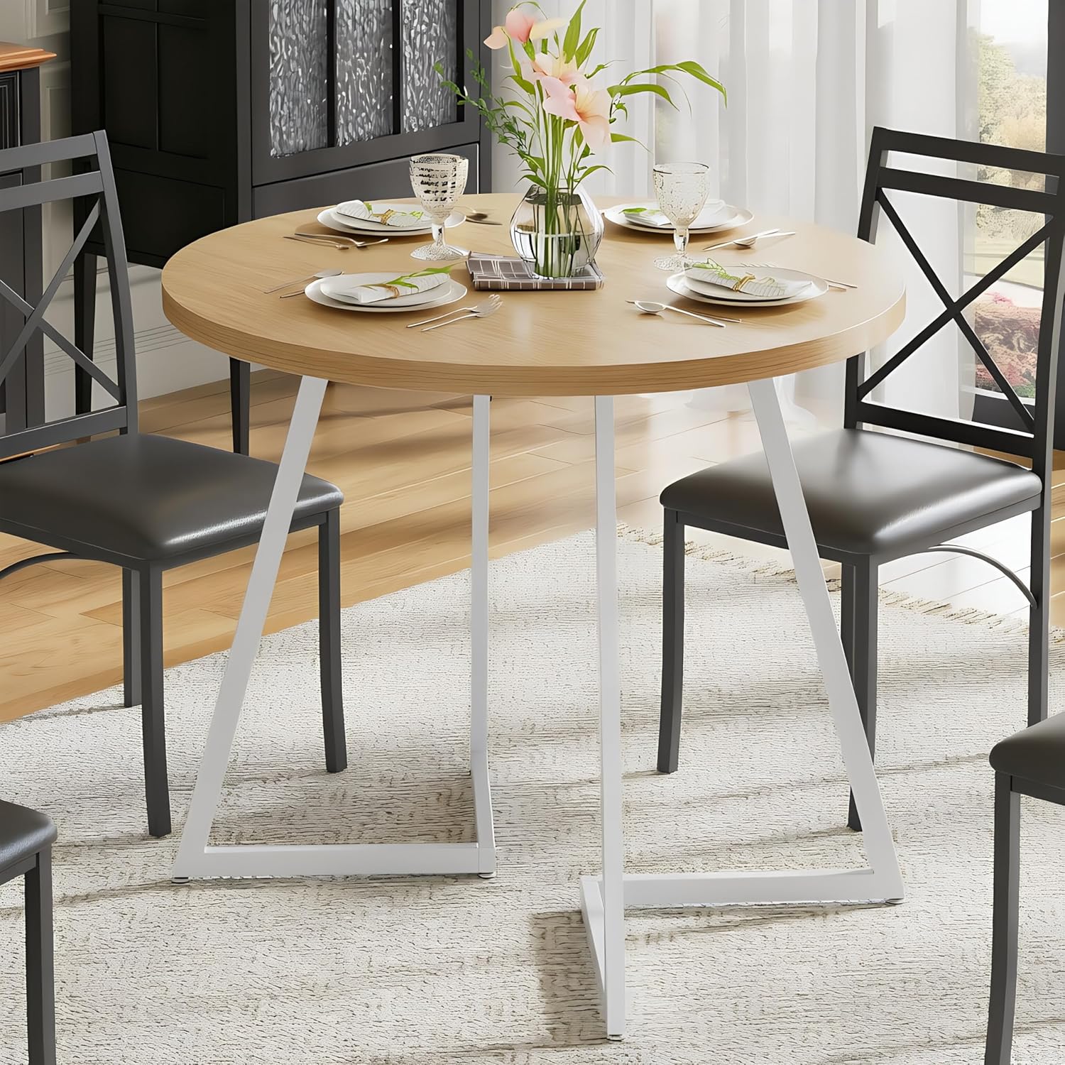 VECELO 3 Piece Round Dining Table and Chairs SetSimple Design & Modern Style➤ Why did you choose this table set?31.5” round table-top can easily accommodate 2–4 people for dining.Ideal for a small space. The X-shaped design frame can easily store the stools neatly under the table.Available in various places, both for daily use & commercial.➤ SpecificationsMaterial: MDF+ SteelRound Table Size: 31.5'' x 31.5'' x 30'' (L × W × H)Max. Lord: Table bears 220 lbs