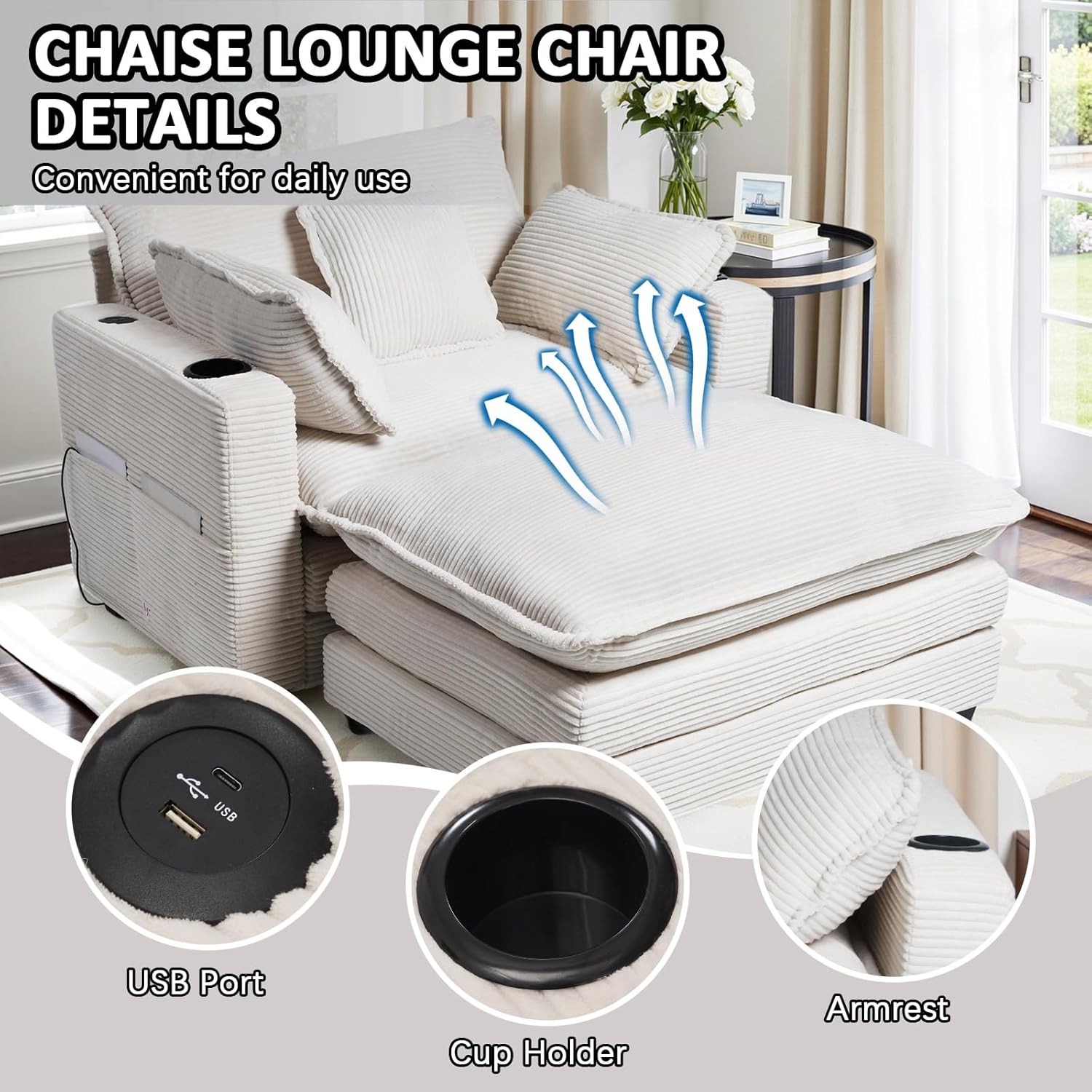 Gexpusm Oversized Chaise Lounge Chair Indoor with Ottoman,Corduroy Sofa Chair with Storage Deep Seat Sofa,Chairs and Ottoman Set with USB Port & Cup Holders,Couch Sofas for Living Room (Beige)