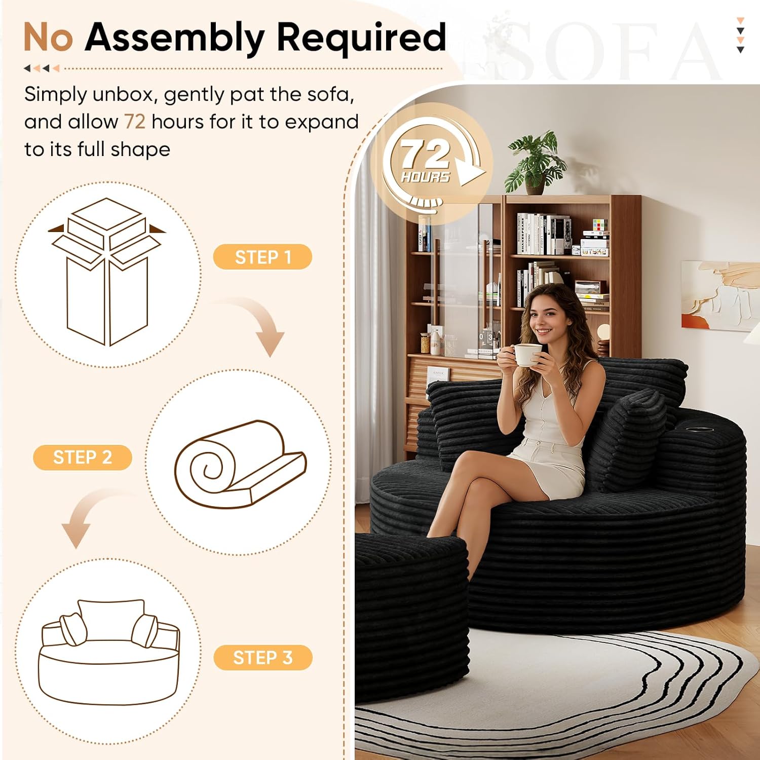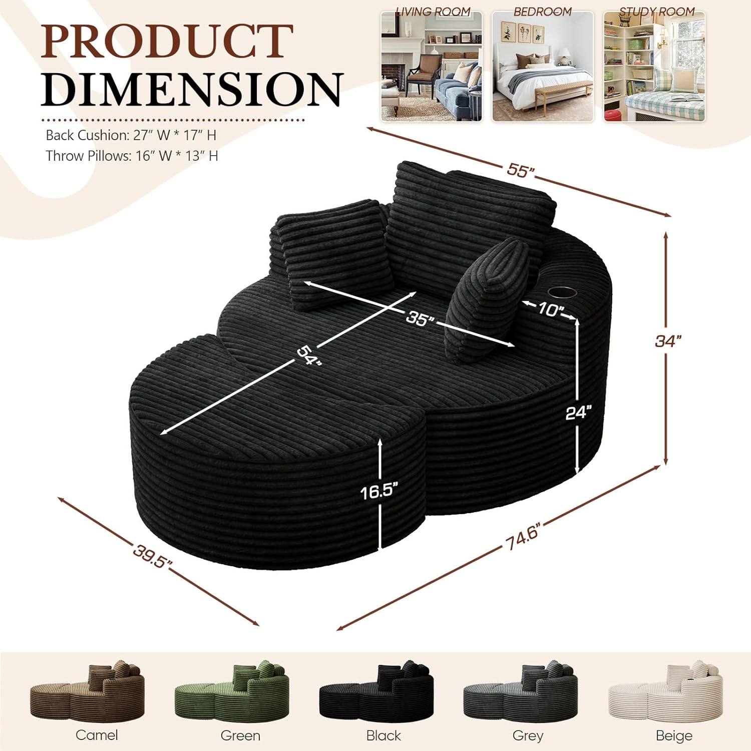 SpecificationOverall size: Round chair: 55” D * 55” W * 34” H, Ottoman: 19” D * 39.5” W * 16.5” HSeat size: 35" W * 54" DArmrest width: 10"Armrest height: 24"Seat height: 16.5"Seats: 1 SeatWeight capacity: 400 lbs/seatPillow Cover: Detachable and WashableMaterial: Corduroy/Chenille for Choosing