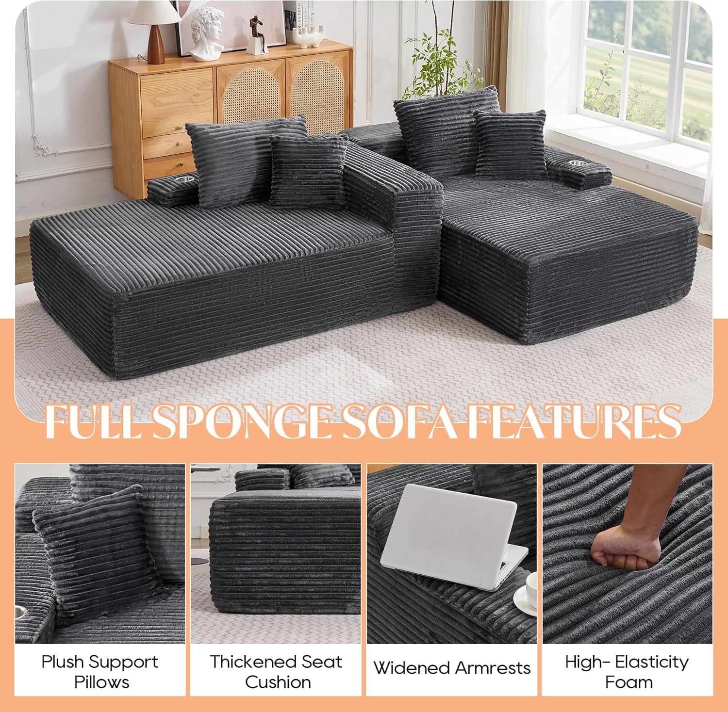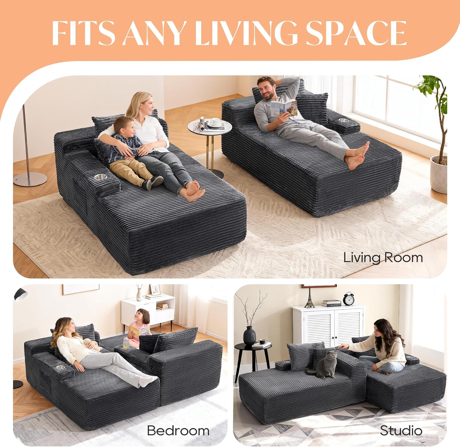SnyFivv 85 Inch Double Chaise Lounge Chair Indoor, Oversized Corduroy Upholstered Boneless Sofa Bed, Deep Seat Sleeper Couch Reading Chairs Cloud Sofas for Living Room, No Assembly Required, Gray