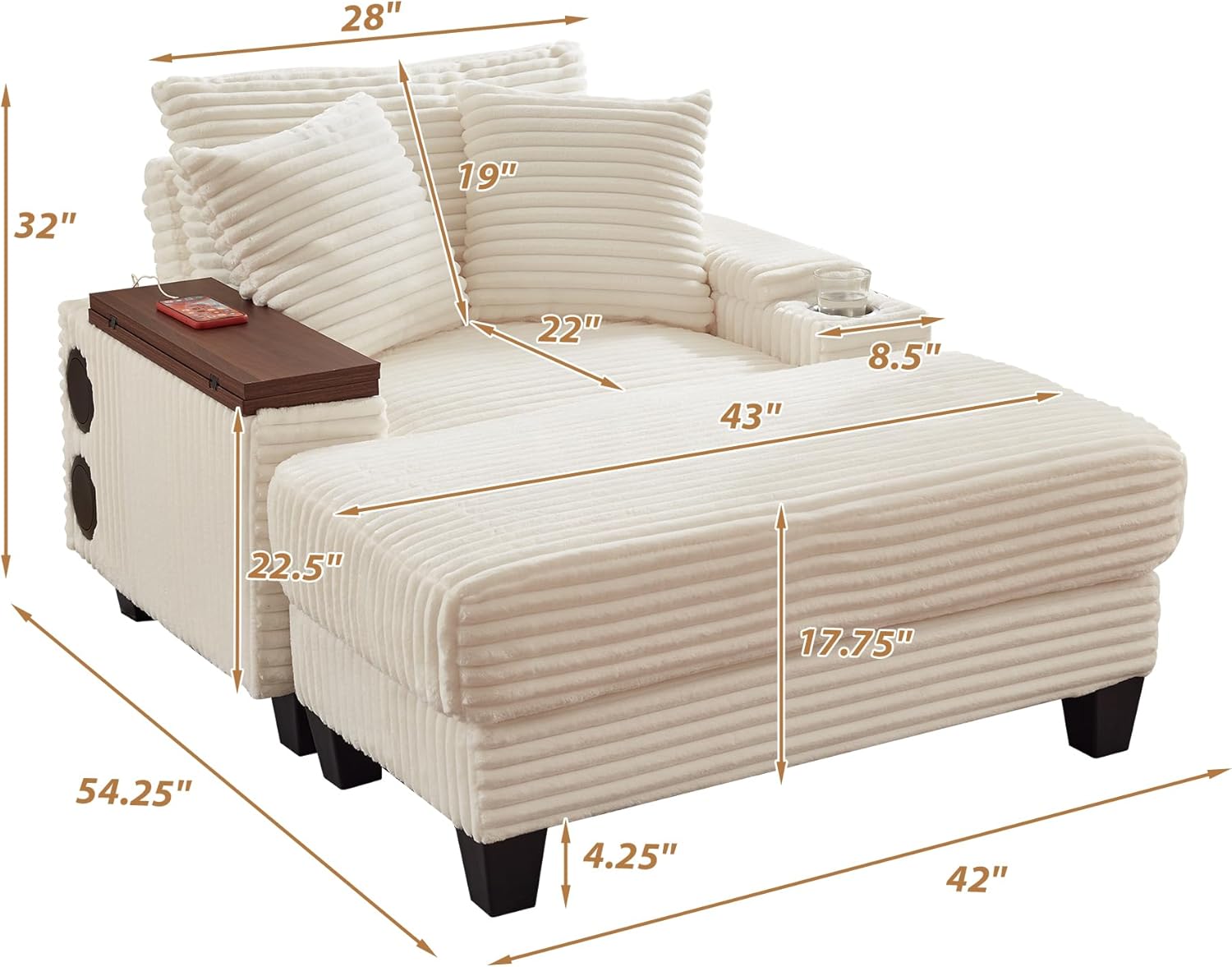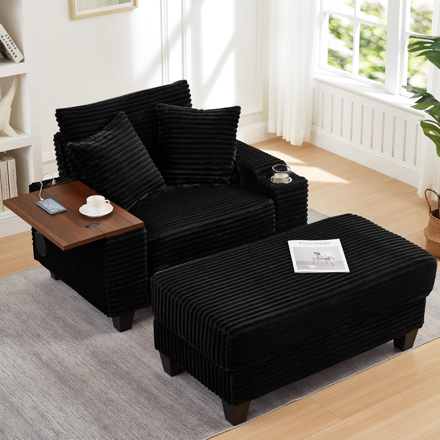 Transform your living space with our all-in-one oversized chaise lounge chair and ottoman set, designed to offer premium comfort, modern convenience, and lasting stability. This multifunctional accent chair seamlessly integrates a swivel side table, hidden storage, and immersive music technology, creating the ultimate relaxation hub for your living room, bedroom, or reading nook.Specifications:Overall Dimensions (Assembled): 31.5" (D) x 33.5" (W) x 40.2" (H)Seat Dimensions: 25" (W) x 22" (D)Ottoman Dimensions: 22" (W) x 17.7" (D) x 15.7" (H)Rotating Table Board: 22.5" (L) x 15.7" (W), supports up to 22 lbs.Recommended User Weight: 330 lbs.Features:25-inch wide seat cushion filled with high-resilience, high-density foam that contours to your body, reducing pressure points.The oversized 8.5-inch wide armrests provide ample space for arm and elbow support.Upgraded 180° Swivel Table: Mounted on the right armrest, this large, sturdy tableboard can be effortlessly flipped up and rotated to your preferred angle. It serves as a stable surface for meals, a laptop desk for remote work, or a convenient side table for books and tablets.Storage Arm: The left armrest houses a spacious hidden compartment with a lift-top lidCup Holder: Keep your beverages secure and within easy reach. Modern Tech Integration: Features two built-in 5W music sound for a sound experience.What's Included: 1x Oversized Chaise Lounge Chair 1x Removable Ottoman 2x Lumbar Pillows 1x Set of Assembly Hardware & Tools 1x Instruction Manual
