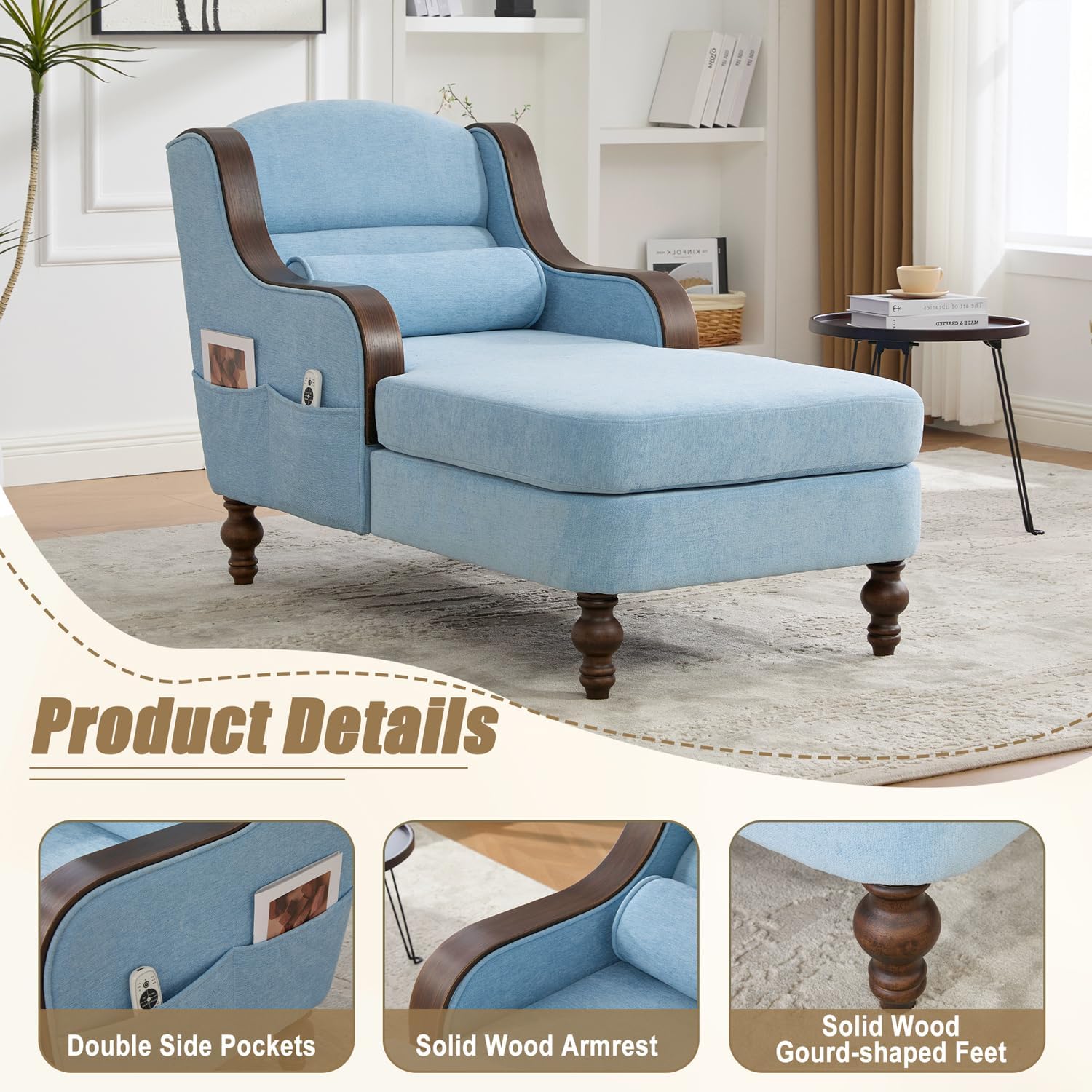Chaise Lounge Chair Indoor, Chenille Upholstered Comfy Reading Chair with Solid Wood Legs & Side Pockets, Modern Cozy Sofa Chair Sleeper for Living Room Bedroom Office