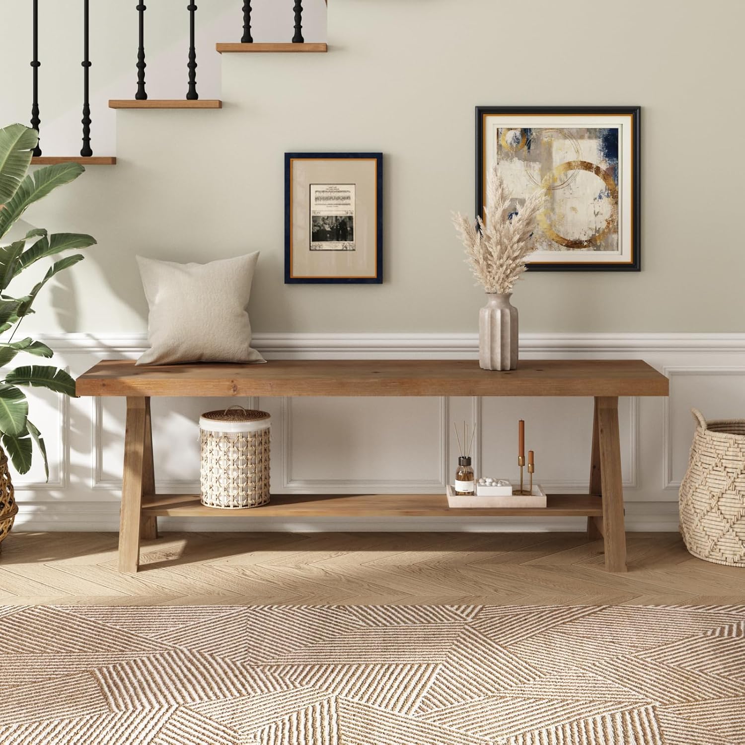 • 【Use Scene】-Natural wood kitchen entryway bench with armless design and short height can be used as a shoe bench, extra seating in the hallway, dining bench or bedside bench. Whether it's bedroom, living room, dining room, entryway, foyer, kitchen or patio, the entryway bench is perfect for the job
