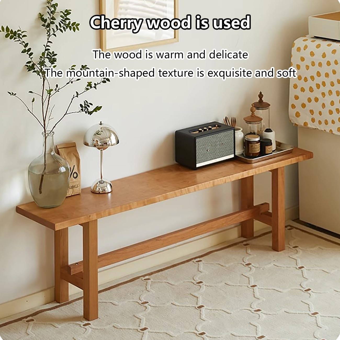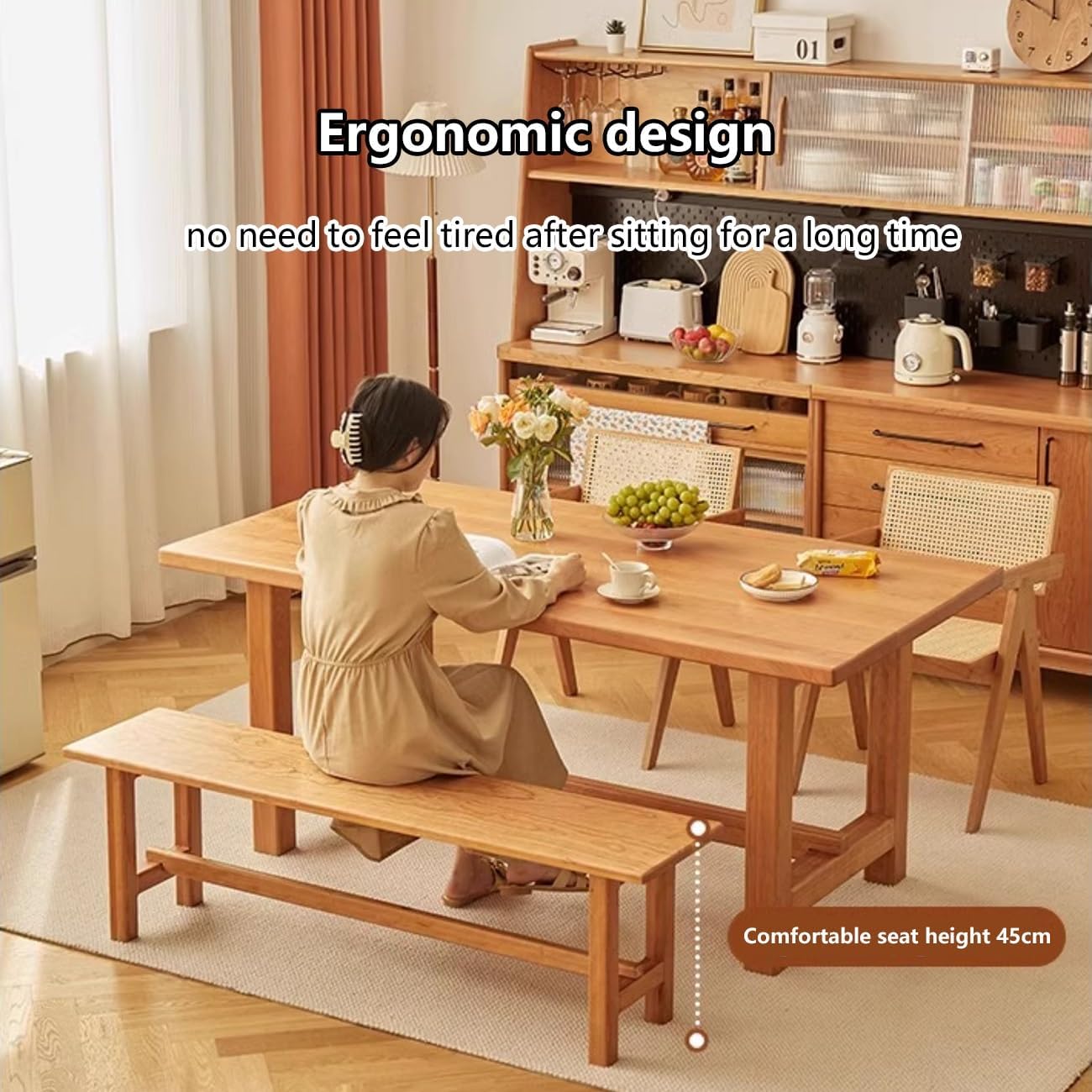 Choose a matching bench to experience the best happiness in life!Features:The smooth board surface is free of any cracks and burrs, and is easy to maintainThe overall frame is supported by solid wood to achieve a balance between lines and proportions, while ensuring good safety and stabilityShoe-changing bench Dining bench Bed end bench Flexible and versatile, wide seat surface accommodates your willful sitting posture and receives multiple guestsRounded without sharp corners, smooth and beautiful lines, safe and durable, natural wood grain texture is also quite charmingThis rustic farmhouse furniture is not limited to practical dining table benches, but can also be perfectly integrated into living rooms, corridors, terraces and foyers, bringing an elegant and classic sense of luxury to decoration and unique style.The rural farmhouse style adds a classic touch to different home or room decorations