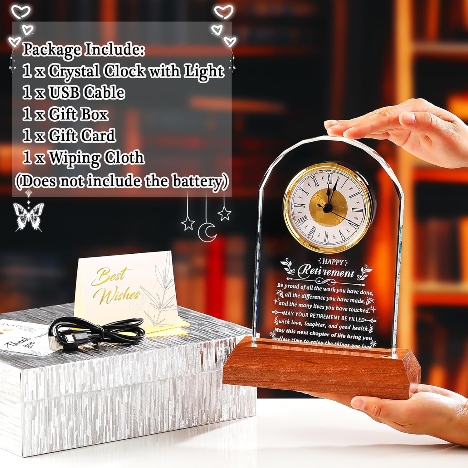If you are looking for a gift to celebrate the retirement of a colleague, boss, teacher, nurse, doctor, or friend, please choose our retirement clock. This retirement gift is filled with deep gratitude and warm wishes, sincerely wishing them all the best in their future lives This keepsake features a quartz clock and an LED base. It can stand upright and be placed anywhere in her/his home, such as on a desk, bookshelf, coffee table, dressing table, next to the fireplace, bedside table, cabinet, or display case, creating a warm and meaningful atmosphere. (Tip: The text on the glass is white; it looks best against a dark background) Product Specification: Material: Glass Feature: Laser engraving Size: 23x17x6.3cm/9.0x6.6x2.4in Weight: 1.2kg/2.64lb Package Includes: 1 x Clock Keepsake with LED base 1 x USB Charging Cable 1 x Gift Card 1 x Wipe Cloth 1 x Gift Box How to Use the Clock <1>Open the back cover from the gap <2>Put in a 1.5V AA/LR6 battery*(Battery is not included in the package) <3>Rotate the circular gear to adjust the time