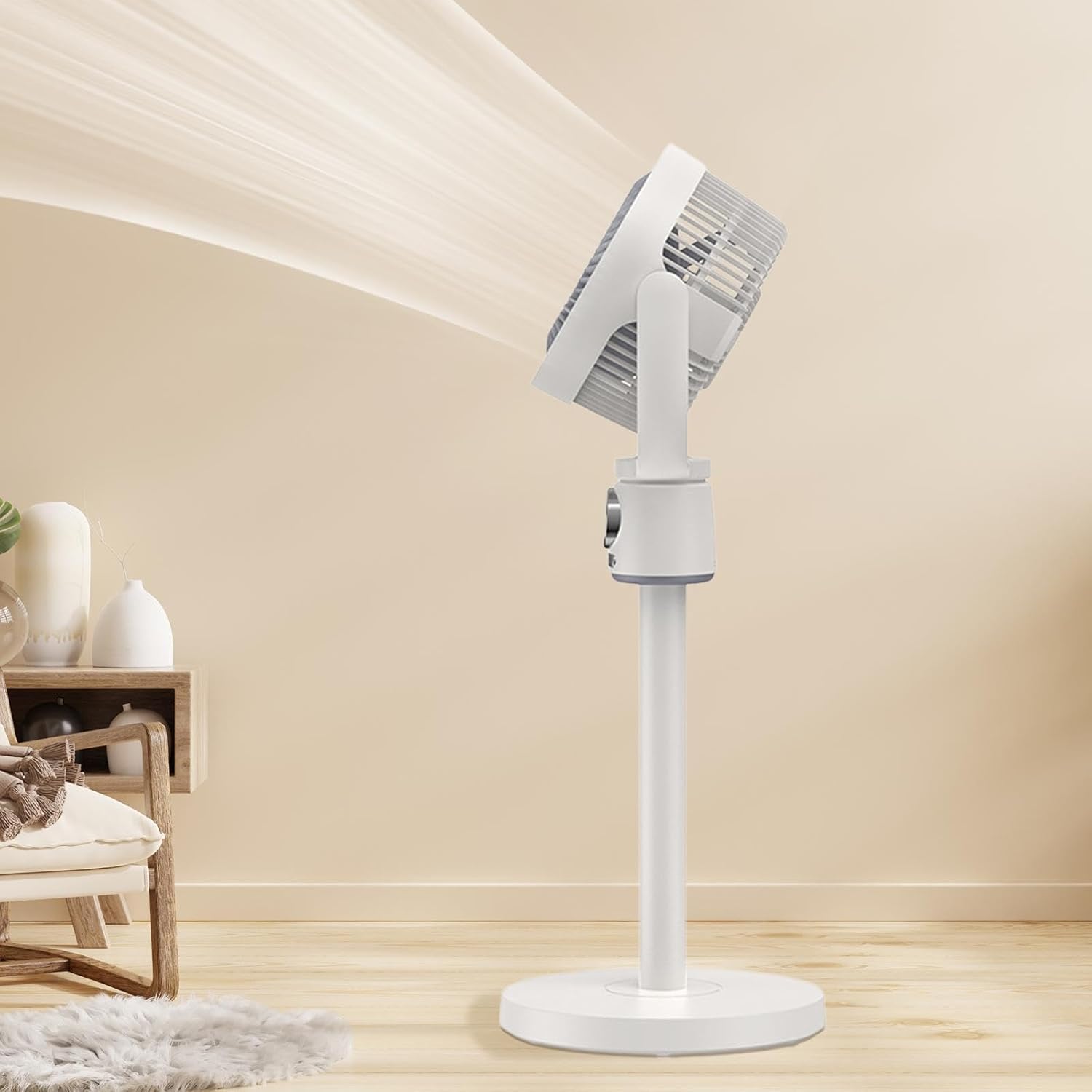 Description: - 【Oscillating Pedestal Fan】: The floor fan can swing left and right and up and down to supply air in all directions, so that you can feel cool quickly. - 【Adjustable Height】: The pole of the standing floor fan is detachable, it can also be used as a desk fan, with a handle, easy to move and carry, very suitable for travel, camping, home use. - 【Intelligent Stand Fan】: Air cooling fan is equipped with a control and a intelligent panel, which can be controlled by the control. The real time digital display intelligent panel allows you to easily understand the current wind force and air volume, and is easy to use. - 【Function】: Stand Fan has a soft night light, so you don't have to worry about getting up at night. 9 hours timer for easy on and off for you. The net cover is detachable, and there is no dead angle for cleaning. - 【Wide Application】: Telescopic floor fan is for home, office, bedroom, living room, party, picnic, camping, etc.Specification: - Charging : 5V 3A - Rated power: 12W - Head swing angle: 140 degrees left and right, 90 degrees up and down - Light source type: LightSize Chart:26cmx26cmx85.8cm/10.24inchx10.24inchx33.78inchPackage Includes:1x Floor Fan1x Control1x Charging Cable(Optional)Note:Please allow slightly errors due to manual measurement and different monitors.