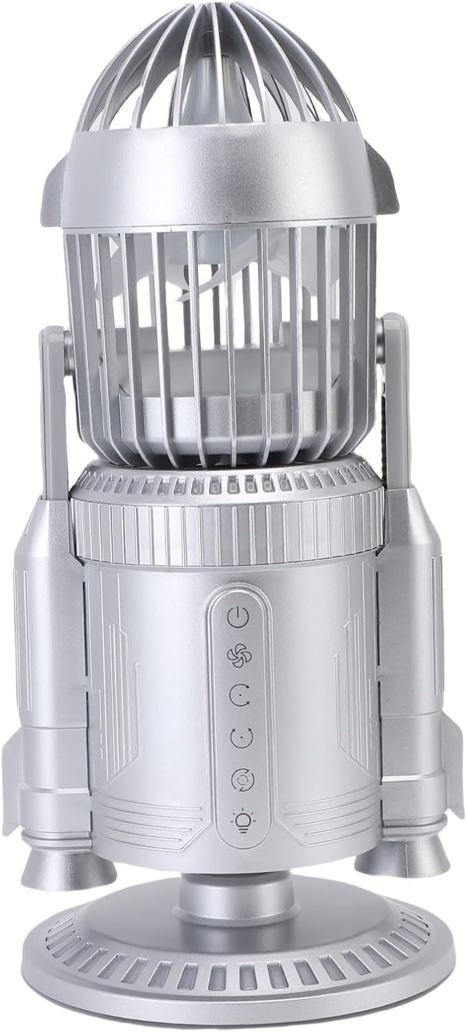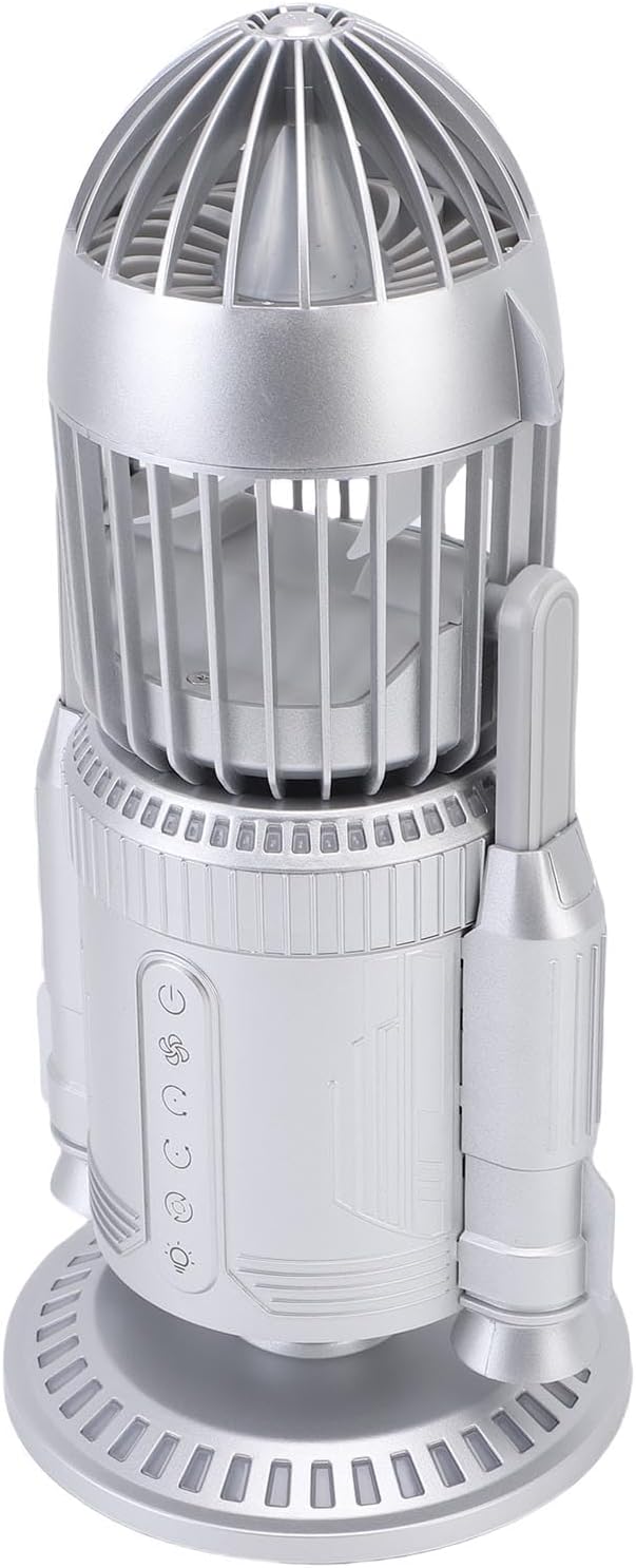 [Rocket Simulation Experience]Enjoy the thrilling ambiance of the Mist Spray Desk Fan, featuring dynamic water mist and LED effects that simulate a rocket. [Powerful Cooling Performance]Equipped with a 5000 RPM motor, this fan delivers strong cooling airflow for up to 12 hours on a single charge. [Quiet Operation]With less than 20 decibels of noise, the fan operates silently, making it perfect for studying, working, or sleeping. [Versatile Angle Adjustment]The 360-degree rotation and 120-degree vertical adjustment ensure cooling coverage in any corner of your room. [User-Friendly Features]Includes a built-in timer with 1-8 hour settings and multiple wind speed options, enhancing comfort during gaming, office hours, or relaxation. Spec: Item Type: Mist Spray Desk Fan Model: RK-1 Material: ABS, POM, electroplating Battery Life: 3 to 12 hours(depending on different gears or functional scenarios) Battery Capacity: 1 x 5000MAH li io battery Charging Power Supply: 2A Packaging Accessories: TYPE C charging cable, user manual Package List: 1 x Atomization Cooling Fan 1 x Base 1 x USB C Data Cable 2 x User Manual How To Use: Use according to the instructions.