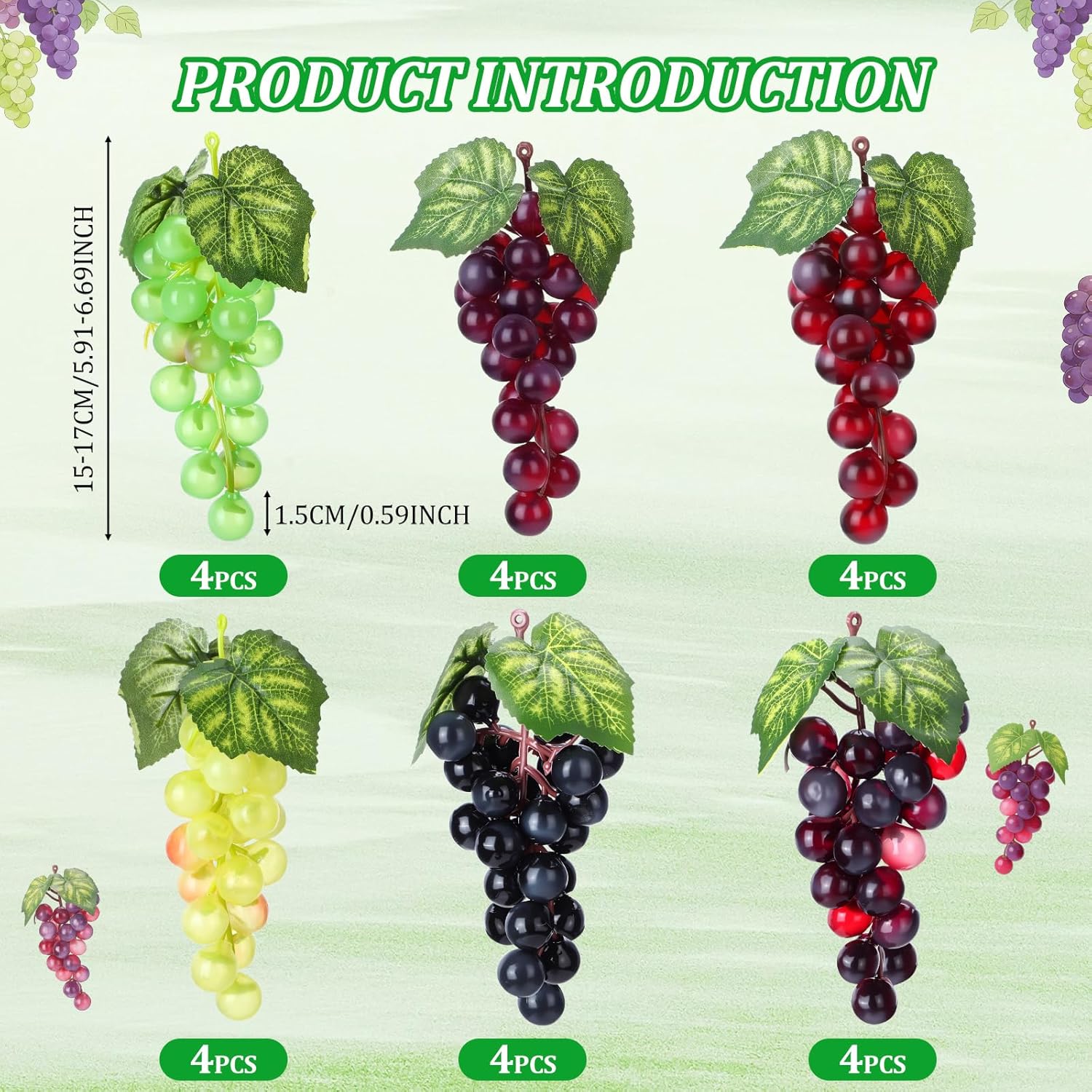 Features: Lifelike Artificial Grape Vines Each stem mimics real grape vines with authentic leaf placement and natural grape cluster formation. The flexible design allows you to shape and arrange them as desired for various displays. Artificial Fruits Decoration Perfect for year-round decoration in bowls, centerpieces, wreaths, mantels, or as kitchen decor. These faux grapes add color and life to any room without wilting or requiring replacement. Specifications: Material: rubber Color: crimson, purple, green, red, yellow, black Size: 6 inch Package includes: 24 x Artificial Grape Notes: Manual measurement, please allow slight errors on size. The color may exist a slight difference due to different screen displays
