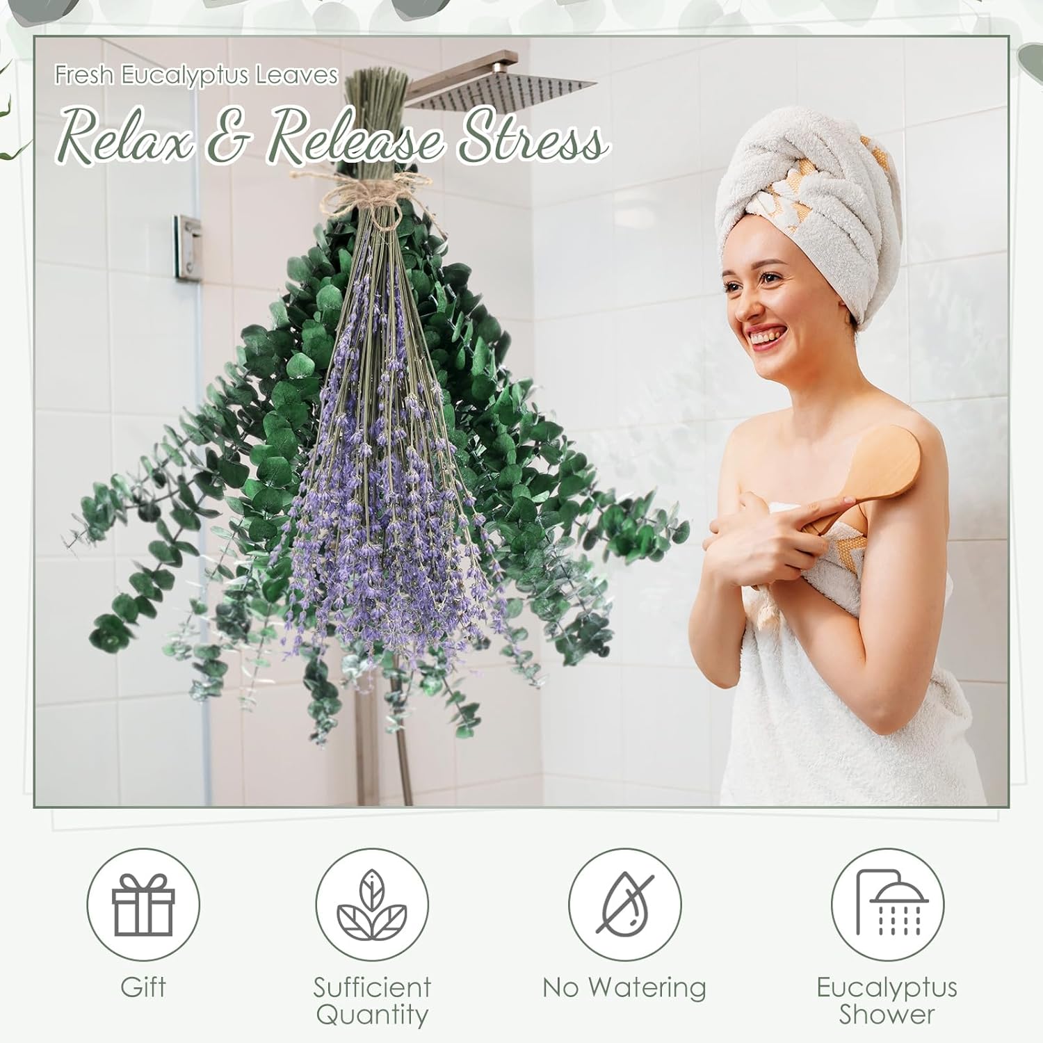 Features: Generous Package for Creative Projects With 30 dried eucalyptus stems and 200 dried lavender flowers included per package, you have ample material for any creative endeavour. Whether you're designing a nature-inspired home decor piece, creating your own gifts, or simply looking to enhance your private space, this generous offering ensures you'll have exactly what you need to bring your vision to life. Easy to Use and Maintain Our products are designed for convenience and ease of use. Simply hang the eucalyptus in your shower or arrange lavender for shower settings to infuse spaces with their delightful aroma. Both the eucalyptus and lavender require minimal maintenance, allowing you to enjoy the beauty, ensuring more time for relaxation Specifications: Material: natural Real Live Eucalyptus Leaves Branches, Lavender Flowers Colour: green Size: about 17'' length Package includes: 60 x Dried Eucalyptus Stems 400 x Dried Lavender Bouquet Notes: Manual measurement, please allow slight errors on size. The colour may exist a slight difference due to different screen displays. Pease note that some lavender buds may fall during unpacking due to their natural characteristics.