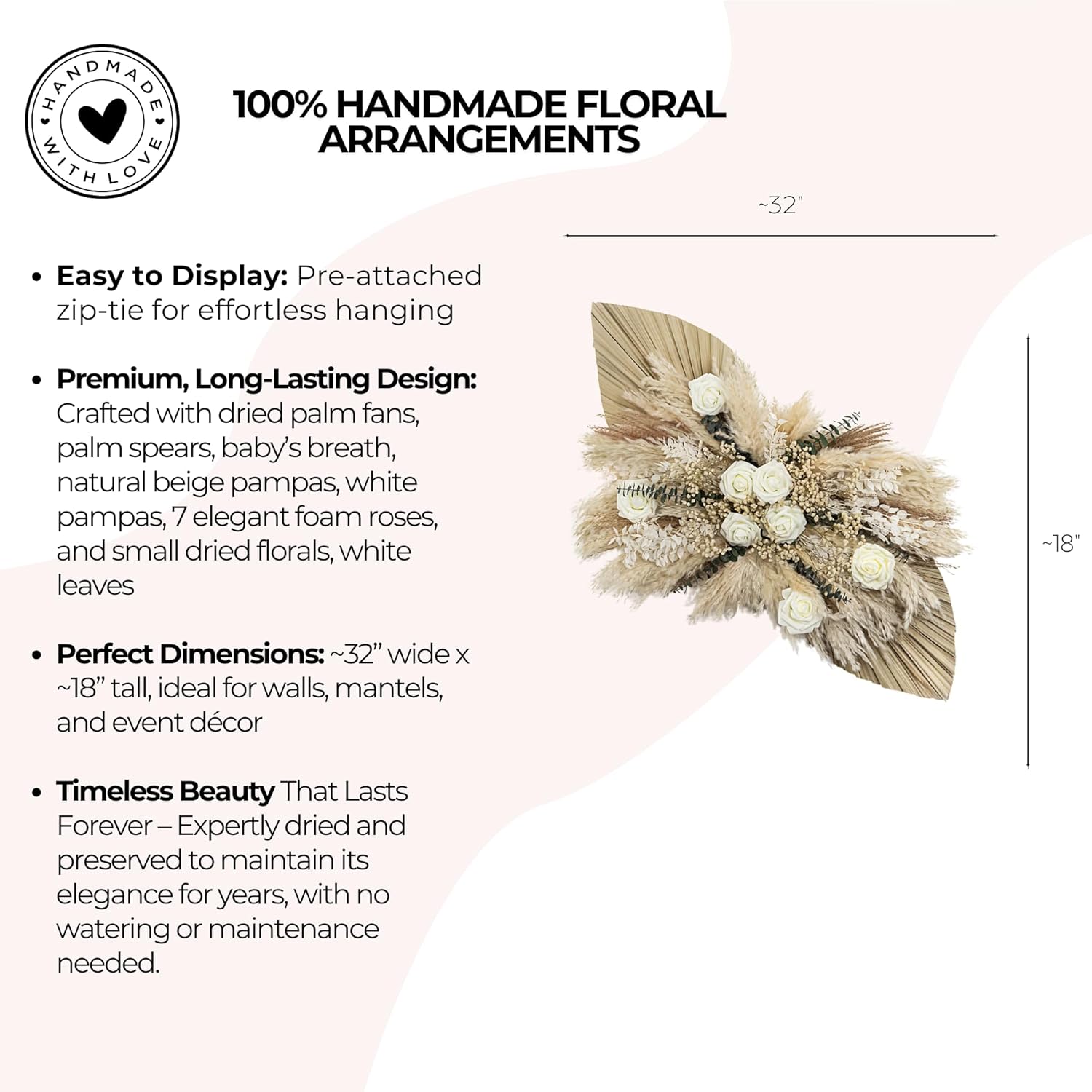 Bring effortless elegance to your space with our handmade pampas grass, eucalyptus, and dried floral arrangement. Designed for those who love boho, rustic, and modern decor, this beautifully crafted bouquet features a stunning mix of soft, fluffy pampas grass, preserved eucalyptus leaves, and delicate dried florals. Whether you're decorating for a wedding, baby shower, bridal shower, or simply elevating your home decor, this long-lasting and maintenance-free arrangement is the perfect addition. Use it as a centerpiece for dining tables, wedding backdrops, entryway decor, or mantel styling. Its neutral and earthy tones blend seamlessly with bohemian, farmhouse, and minimalist aesthetics. Unlike fresh flowers, this real dried floral arrangement will stay beautiful for years without the need for water or care. Perfect as a gift for housewarmings, birthdays, weddings, and special occasions, this dried floral bouquet arrives ready to display, bringing warmth and natural beauty to any space.