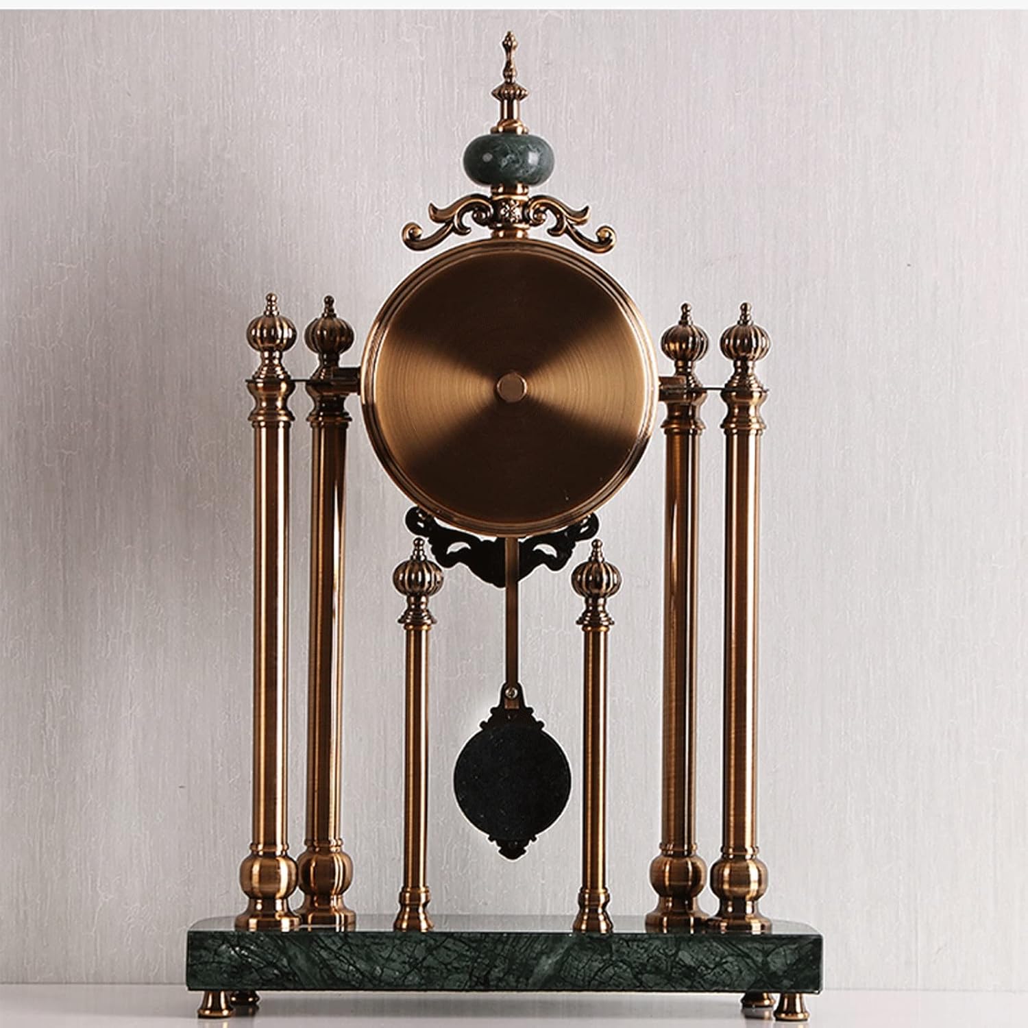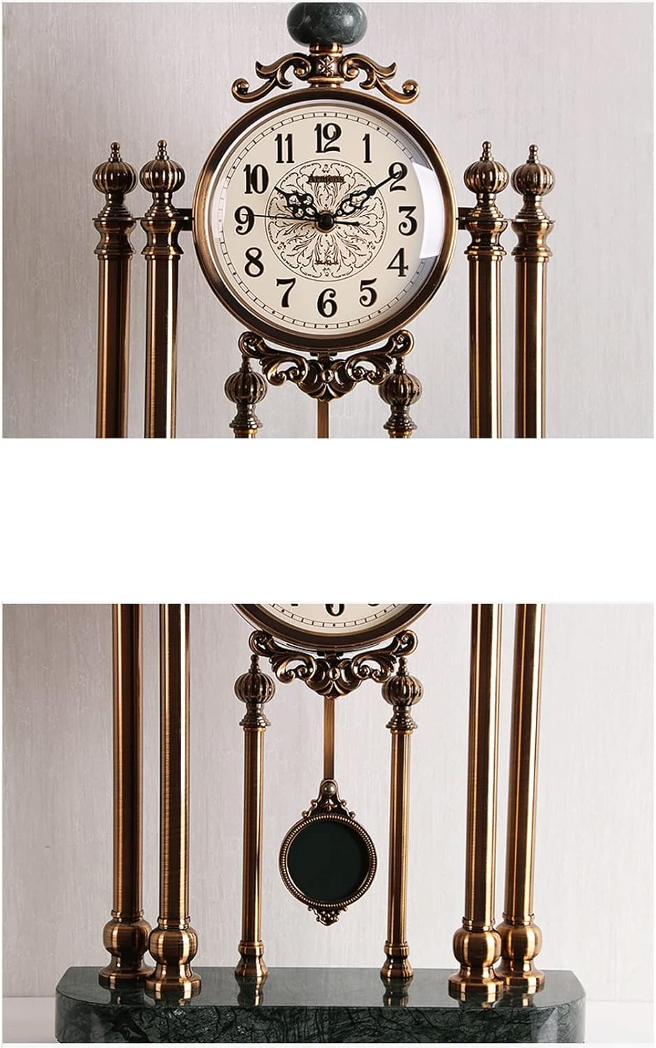 Unique exterior design makes it match with most furnitureClock Table Clock Ornaments Living Room Fashion Desktop Retro Clock Large Mute Home Personality Table ClockName: Table Clock OrnamentColor as shownStyle: VintageMaterial: metal copper plated + marbleMirror material: glassApplicable: living room, porch, bedroom, etc.Power Type: BatteryPackage includes: 1 desk clock (battery not included)notes1 Please check the size and color before purchasing.2 Except for items not shown in product photos.3 Please note that due to different monitors, there may be slight color differences, please understand.4. The above data is for reference only, the size is measured manually, each variable may be different, please refer to the actual product, thank you.5. If you find any problem with our products, please feel free to contact us by email, we will solve the problem as soon as possible.6. Your sharing and feedback are welcome so that we can provide you with better products and services.7. Thank you for visiting my store, click to enter my store, there will be many products for your reference