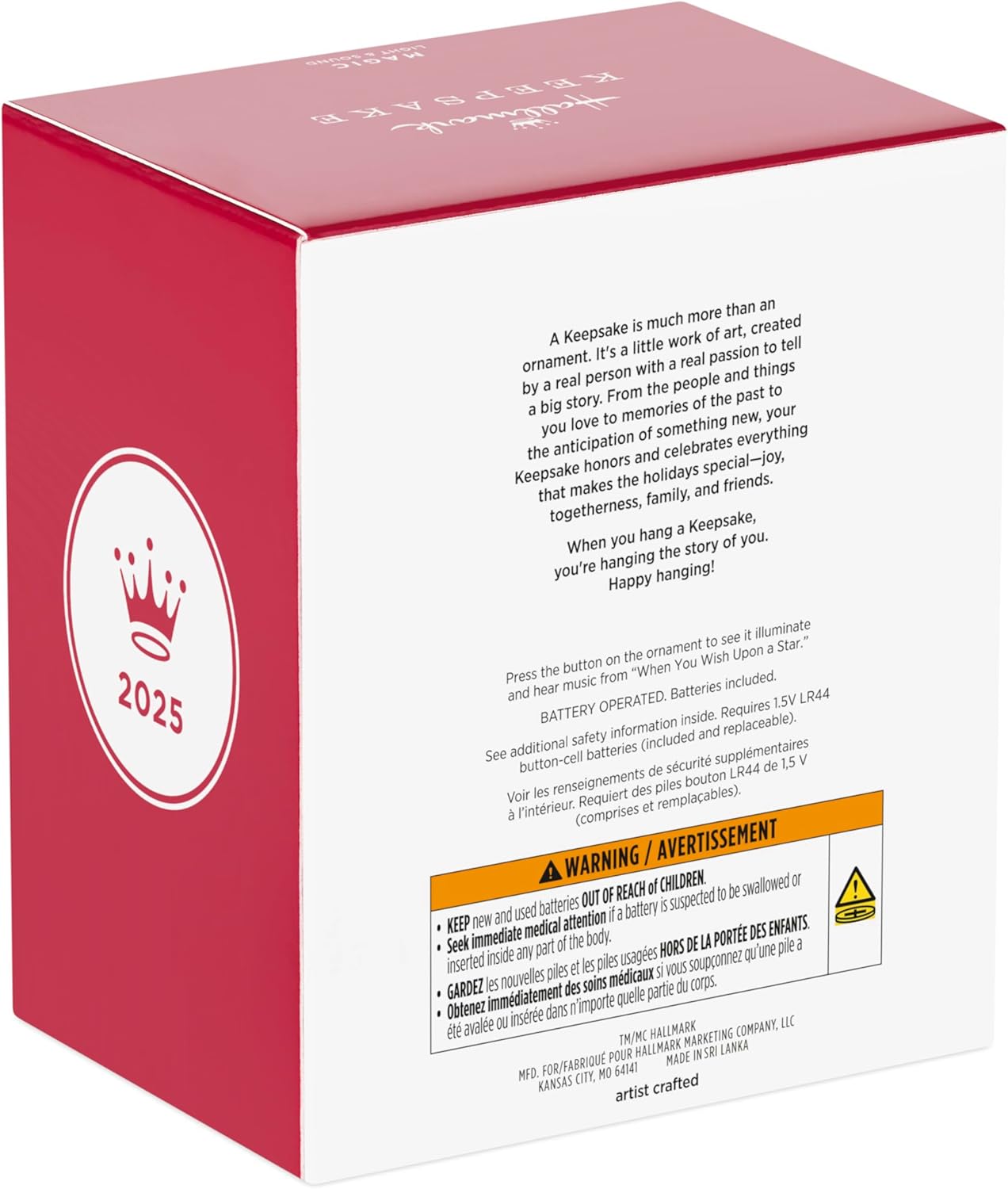 Commemorate the 70 years of The Happiest Place on Earth with this stunning Christmas tree ornament. The Disneyland design features Sleeping Beauty's Castle with an iridescent finish in honor of the theme park's platinum anniversary. Press the button to see a beautiful light show with fireworks as music from "When You Wish Upon a Star" plays. Battery operated. With unparalleled artistry and exceptional detail, Hallmark Keepsake Christmas ornaments are perfect for preserving precious memories, commemorating special milestones and celebrating individual hobbies and interests.