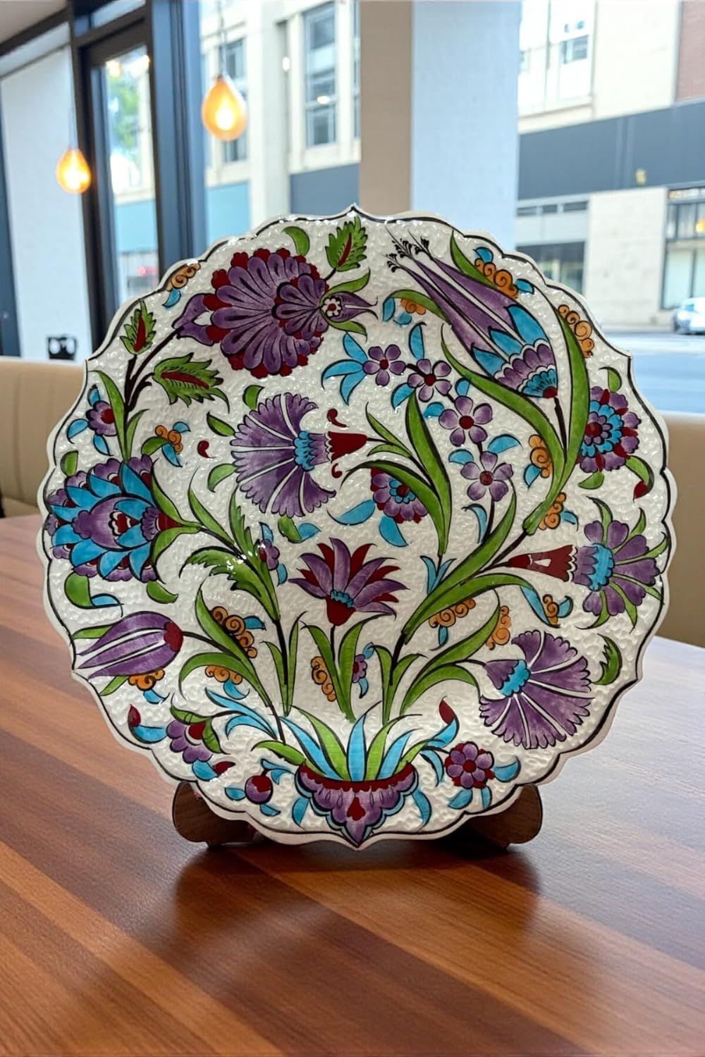 This exquisite handmade ceramic plate showcases the rich tradition of Kütahya pottery. Each plate is meticulously crafted by skilled artisans, ensuring a unique and high-quality piece of art. The intricate design adds a touch of elegance and vibrancy to any room, making it a suitable addition to your home decor. The plate measures approximately 12 inches in diameter, making it appropriate for displaying as a decorative accent. Crafted from durable ceramic, this plate is designed to last for years to come. The vibrant lilac color is achieved through traditional glazing techniques, ensuring a long-lasting and fade-resistant finish. The plate is not only a attractive decorative piece but also a testament to the skill and artistry of Turkish craftsmanship. It comes in a velvet box, making it suitable for gifting. The plate measures approximately 12 inches in diameter and 1 inch in height, making it a versatile size for various display options. Whether you place it on a shelf, a table, or a mantelpiece, it will surely add a touch of sophistication to your living space. Its unique design and vibrant color make it a standout piece that complements any decor style. This ceramic plate is suitable for adding a touch of elegance to your living room, , or dining room. It can also be used as a accent piece for special occasions or as a decorative accent in your office. Its versatile design makes it suitable for a wide range of settings and purposes. To maintain the beauty of this plate, simply wipe it easy to wipe with a soft, damp cloth. Avoid using harsh chemicals or abrasive cleaners, as they may damage the glaze. With proper care, this plate will continue to bring joy and beauty to your home for many years. This handmade ceramic plate makes a thoughtful and unique gift for art lovers, collectors, or anyone who appreciates fine craftsmanship. It is suitable for birthdays, anniversaries, housewarmings, or any special occasion. Give the gift of timeless beauty and artistry with