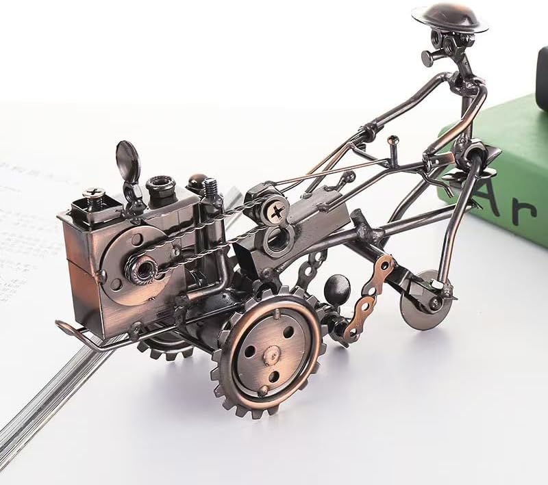 Add a touch of rustic charm to your home or office with this meticulously crafted vintage-style iron tractor sculpture. This decorative piece showcases exceptional attention to detail, from its rotating wheels to the intricate mechanical components, all finished in a striking combination of bronze and black. The model captures the essence of classic farm equipment, making it a perfect conversation starter for any desk, shelf, or display case. The sculpture features articulated elements that demonstrate the mechanical ingenuity of traditional farming machinery, while its durable iron construction ensures lasting quality. This artistic interpretation of agricultural heritage serves as both a sophisticated decorative accent and a tribute to farming tradition. Whether you're a collector of vintage-inspired pieces or looking for unique farmhouse decor, this tractor model brings character and historical flair to any space.