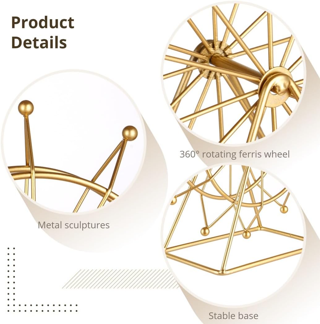 Color: Gold Material: Iron Size: 8.6*3.5*9 in Package Includes: 1*Ferris wheel home decor Note: - Please refer to the measurement. Tiny measuring error is allowable in normal range. - There might be a little color difference due to the monitor, camera or other factors, please refer to the physical item.
