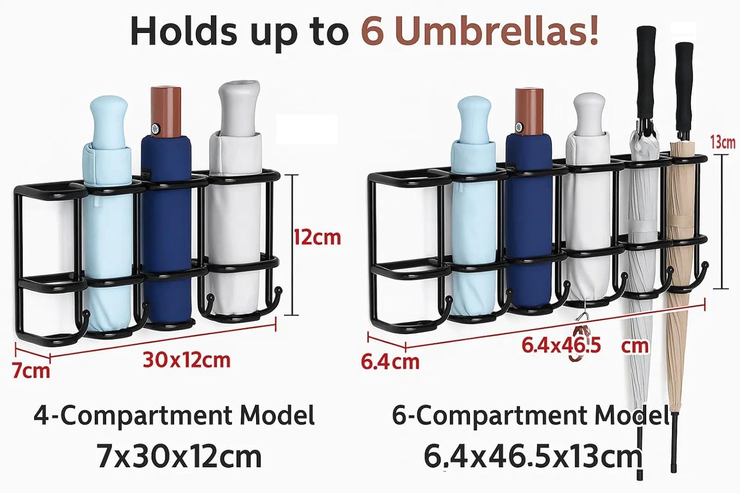 4/6 Compartment Wall Mounted Umbrella Holder Stand – Modern Metal Umbrella Rack Indoor Entryway Umbrella Storage Stand, Space-Saving Umbrella Organizer for Home, Office & ApartmentKeep your space organized and stylish with this umbrella holder stand, a sleek and umbrella rack designed for modern homes and offices.The umbrella stand indoor entryway design saves valuable floor space while keeping umbrellas accessible.It’s perfect for apartments, foyers, and reception areas, and can hold multiple umbrellas of different sizes—travel, compact, or full-length.Thanks to its no-drill installation, this umbrella holder indoor installs easily and securely.Beyond umbrellas, it can also serve as a multi-purpose storage rack for other tall items, combining practicality with modern aesthetics.Whether you need a wall mounted umbrella holder, umbrella holder for entryway, or a rain umbrella stand, this umbrella stand indoor adds elegance, convenience, and functionality to any space.