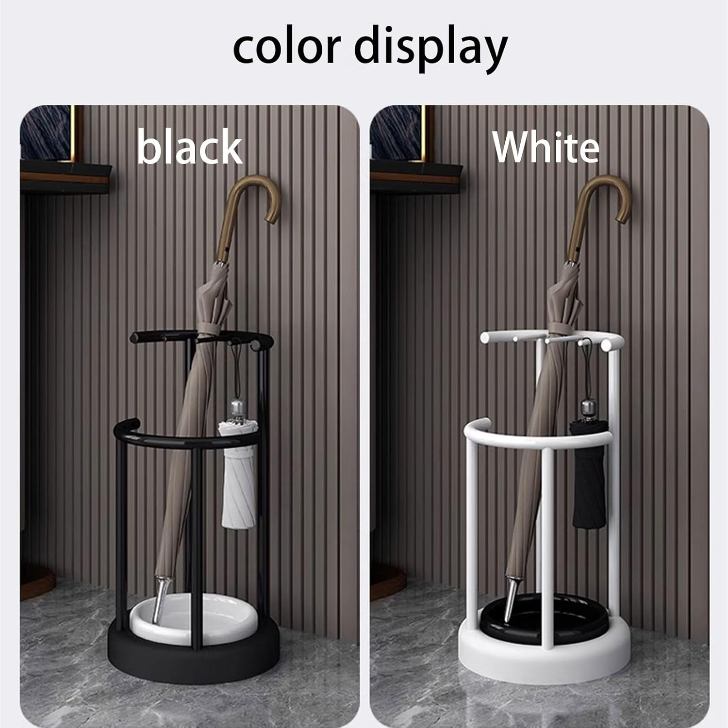 umbrella stand,The metal is designed to keep your entryway nized and stylish, featuring a removable plastic drip tray that protects your floors from water damage. No need to worry about unsightly puddles on your hardwood or laminate flooring! With three convenient hooks, you can easily hang your folding umbrellas, ensuring they are always within reach. This versatile umbrella holder accommodates various umbrella sizes, from large walking-stick umbrellas to compact mini models. The sturdy steel frame provides secure storage for your larger umbrellas, while the raised edge allows you to hang your folded ones effortlessly. Whether you're coming in from a rainstorm or just need a place to store your umbrellas, this stand caters to every need. The removable drip tray not only keeps your floors dry but is also simple to clean, making maintenance a breeze. Say goodbye to cluttered floors and hello to a tidy, modern entryway by placing this umbrella storage rack in the corner of your home. Its rounded base enhances stability and prevents floor scratches, ensuring your looks great in any setting. Available in classic black and white, it complements any decor style. Product dimensions: 30 x 41 x 57 cm; Product weight: 1.4 kg. For care instructions, simply wipe with a dry cloth to keep it looking new. Elevate your home nization with this functional and chic !