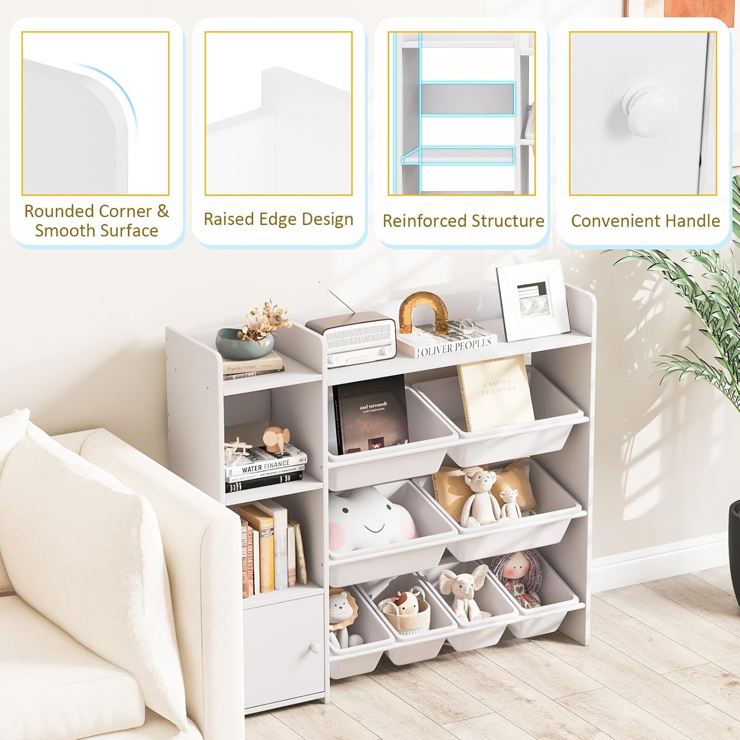Kids Toy Storage Organizer, 4-Tier Multi-Functional Bookcase w/8 Removable Storage Bins & Large Cabinet, Children Toddler Bookshelf and Toy Organizer for Playroom, Nursery, Daycare (White)