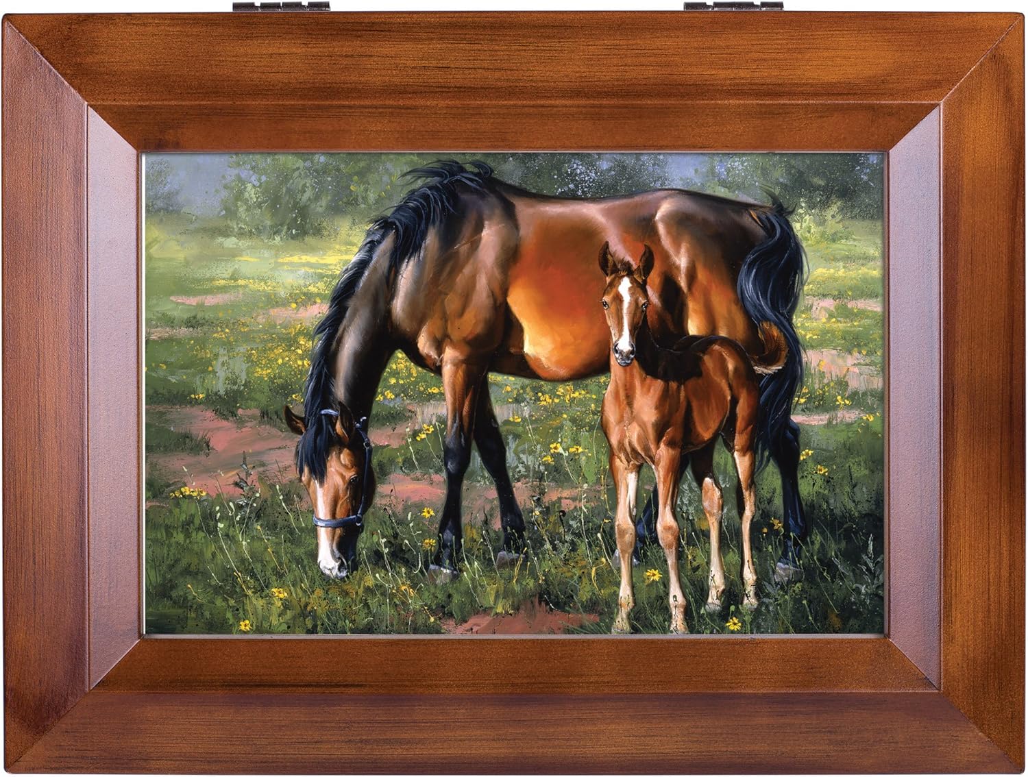 This is a beautifully designed music box by Cottage Garden Collections that features a rich walnut wood finish. It plays a high quality Sankyo music mechanism that can be seen on the inside of the box through protective glass. It plays the tune You Are My Sunshine. It has a 4x6 photo frame lid so the picture can be exchange for a personal photo. The feet are cushioned so they don't scratch surfaces. The box has a 4x4x1.5 inch cavity for storing jewelry and keepsakes. The inside is lined in nice black velvet. The hinges prevent the lid from falling all the way back and getting damaged when opened. This makes a beautiful gift for any age.