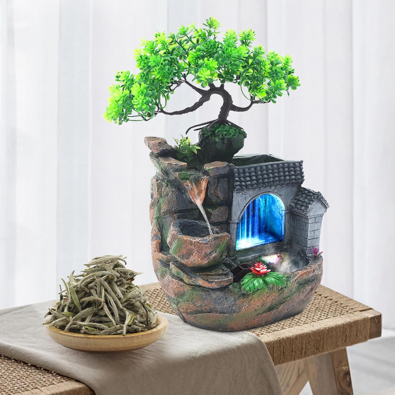 Product DescriptionSpecificationColor: Green, ClearStyle: ModernMaterial: ResinProcess: Colored PaintingShape: TreeMounting Type: TabletopIndoor/Outdoor Use: IndoorAssembly Required: YesPower Source: Corded ElectricPlug Type: US StandardLight Source: LEDLight Colors: ColorfulPower: 3.5WVoltage: 110VPower Cord Length: 1.4m/ 4.59ftProduct Size: 30*20*38cm/ 11.8*7.87*14.9inKey FeaturesBuild to Last: High-quality resin and exquisite colored painting process make it strong, durable, and environmentally friendly, so it can remain beautiful and practical.Embrace Nature: Using simulation landscape modeling, this fountain with rockery, trees, a stone mill, and houses can make you feel the charm of nature, and create a peaceful and natural atmosphere.Mental and Physical Relaxation: Turn on the waterfall fountain before bedtime, listen to the calm sound of flowing water, and fall asleep, making you more relaxed. It can also be placed in a baby's nursery, allowing them to enjoy the gentle sound of a small stream and soft night light. You can also use it when trying to meditate or practice yoga.Multi-purpose: The wonderful rockery and natural imitation greenery are charming and unique and can be used as decoration to add color to your tabletop. In addition, it can also be used as a fish tank to add interest to your space.Atomizer Design: It comes with an atomizer, the fogging effect can make the desktop fountain lifelike and unique, beautifying the space while achieving healthier air humidity levels all around you. You can also put a few drops of essential oil(not included) for a more soothing effect.Auspicious Meaning: Layers of flowing water flow down the rockery, signifying a step up and constant good luck. You can give this meaningful product as a gift to your friends, family, and colleagues on birthdays, Christmas, Thanksgiving, and other holidays.LED Light Source: The energy-saving and environmentally-friendly LED light source with multiple colors can not only protect your eyes but can also create a better atmosphere for you.Simple Installation & Preparation: The simple structure, complete accessories, and convenient switch ensure that you can complete the installation and start using it in a short time. Practical Pump: The pump can achieve a sustainable circulating water supply, making the water safer, cleaner, and algae-free.Rich Colors: This desktop ornament is delicately colored, giving it a richer and fuller color and impressing people with the details.Hidden Layout: The back wiring can further keep the product beautiful.Solid Base: The large base(11.8*7.87 in) increases the stress area, so it can maintain the stability of the product.Application: It can be placed as decorations in the living room, corridor, entrance, study, restaurant, bookstore, study room, bedroom, yoga room, meditation room, conference room, office, etc. It is also suitable to be presented as a beautiful symbolic gift to your leaders, colleagues, friends, and relatives.How to Install1.Find the water pump in the white box.2.Find the three-way interface.3.Pull out the upper tube.4.Put in the light on the water pump.5.Push the light on the water pump to the top.6.Reconnect the upper pipe.7.Connect the lower pipe to the water pump.8.Connect the pump and put it inside the product.9.Just add water to the water pump.10.Plug in and see the effect.How to Install the Atomizer1.Open the atomizer in the box.2.Put the atomizer head in the sink.3.Connect the atomizer connector and transformer.4.Just plug in the transformer plug.Package Included1* Desktop Fountain1* Atomizer1* Power Cord with PumpAll Accessories for Installation