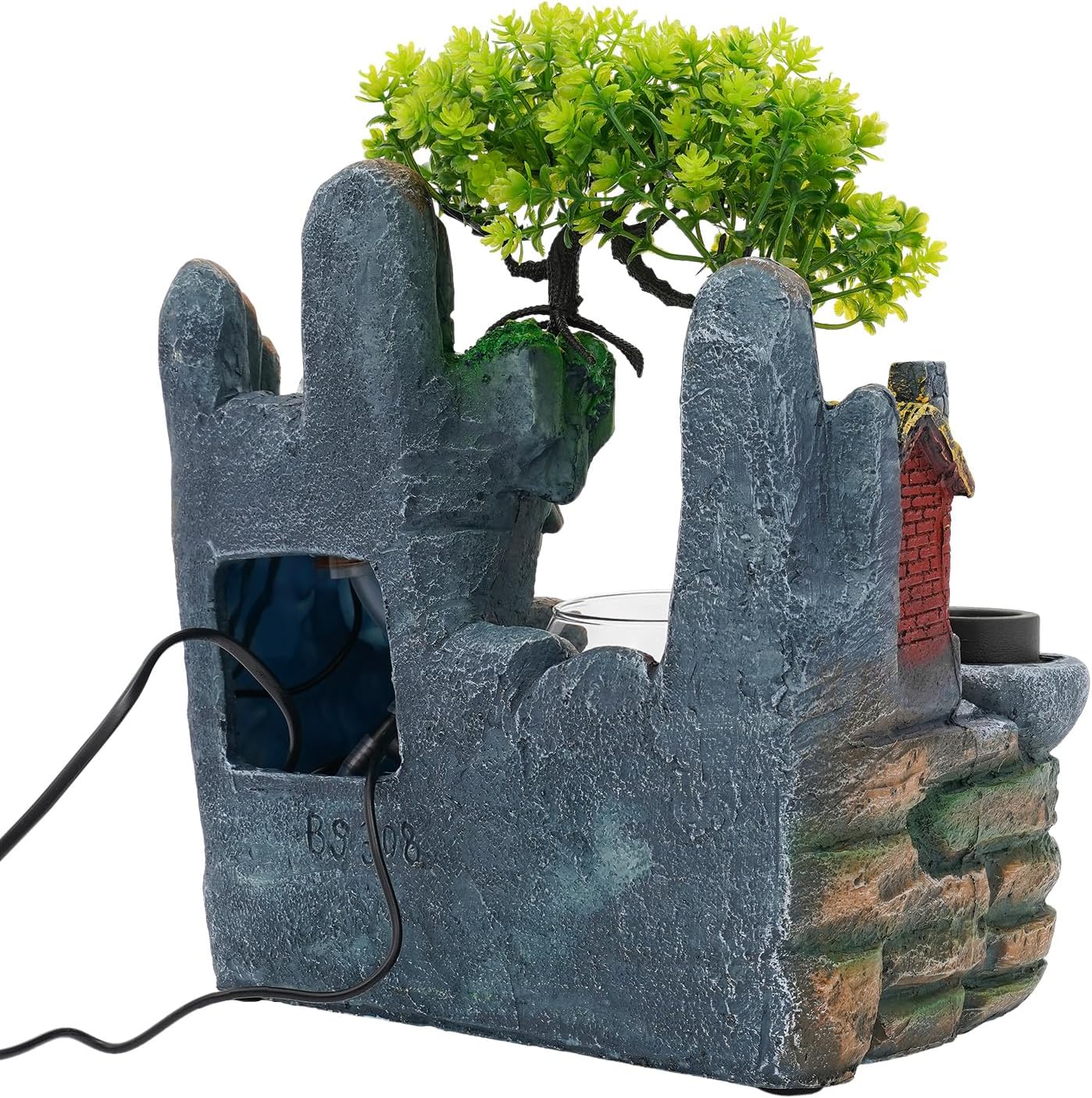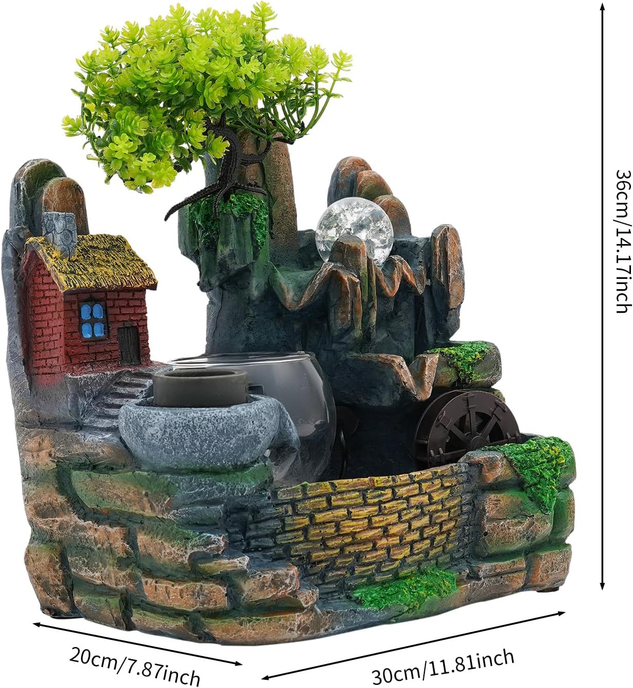 DetailsPractical Water Pump: The pump can achieve a sustainable circulating water supply, making the water safer and cleaner.Solid Base: The rectangular base increases the stress area, so it can maintain the stability of the product.Fish Bowl: Enough space at the bottom allows you to put small fish (not included) in it, adding more vitality to the whole room.ApplicationIt can be placed as decorations in the living room, corridor, entrance, restaurant, bookstore, study room, bedroom, yoga room, meditation room, conference room, office, etc.SpecificationsMaterial: Resin, GlassColor: MulticolorStyle: ModernMounting Type: TabletopIndoor/Outdoor Use: IndoorAssembly Required: YesLight Source: LED(Included)Power Source: Corded ElectricPlug Type: US StandardLight Color: Multi-coloredWater Pump Voltage: 110VAtomizer Voltage: 24VPower: 4WProduct Size(L×H): 30×36cm/11.81×14.17inPackage Size: 37×37×25cm/14.57×14.57×9.84inGross Weight: 4.1kg/9.04lbsNet Weight: 3.9kg/8.6lbsPackage Included1×Desktop Fountain1×Water Pump1×AtomizerAll Accessories for AssemblyNotes1.Please do not turn on the water pump and atomizer without water. During installation, the water pump should be placed in the water, and the water level should exceed the water pump. To avoid short circuits caused by corrosion, please use clean water.2.After a long time of use, please clean the scale inside the water pump. It is recommended not to keep the water pump running for 24 hours to extend its service life.3.Please note that the single operation time of the atomizer should not exceed 4 hours.4.Please allow the slight color difference caused by the shooting light and 1-3cm error due to manual measurement and make sure you do not mind before ordering.