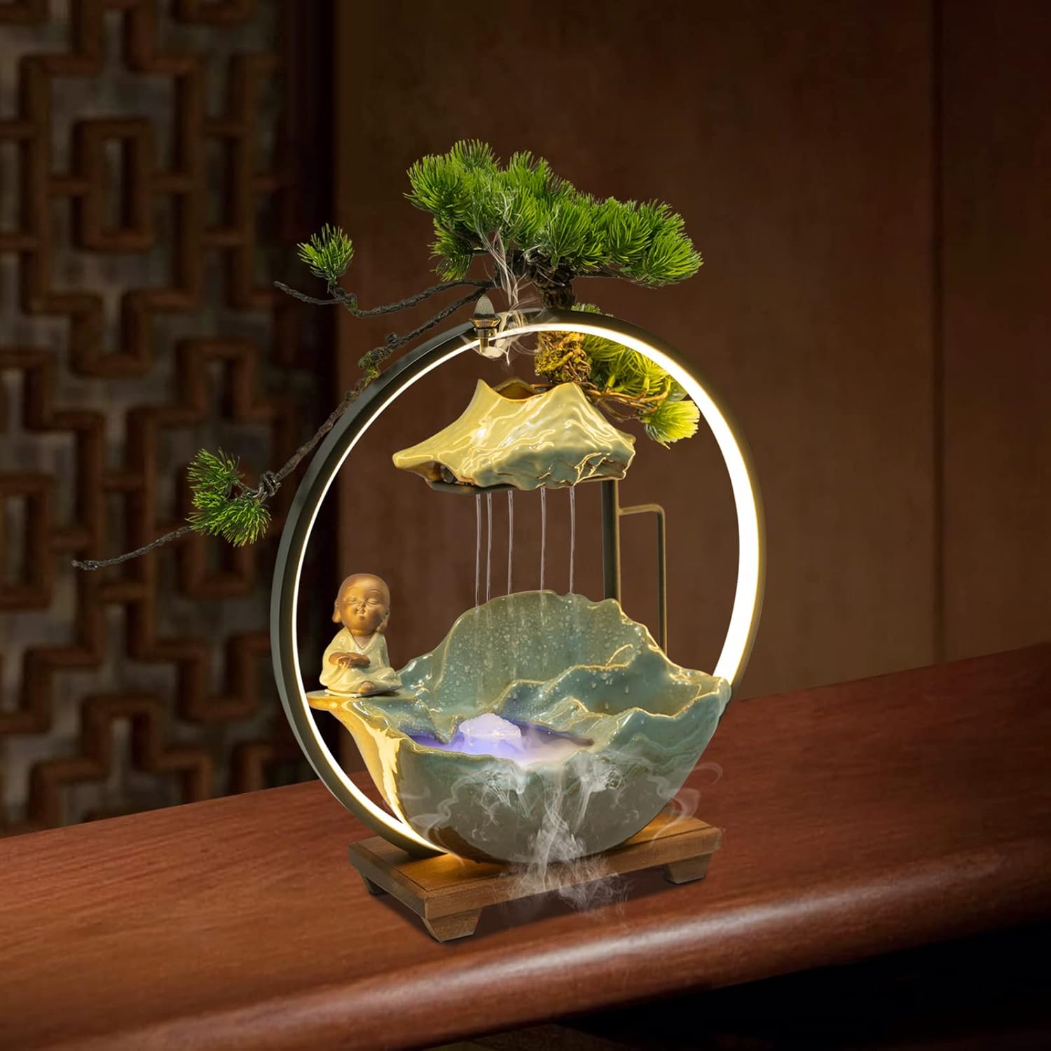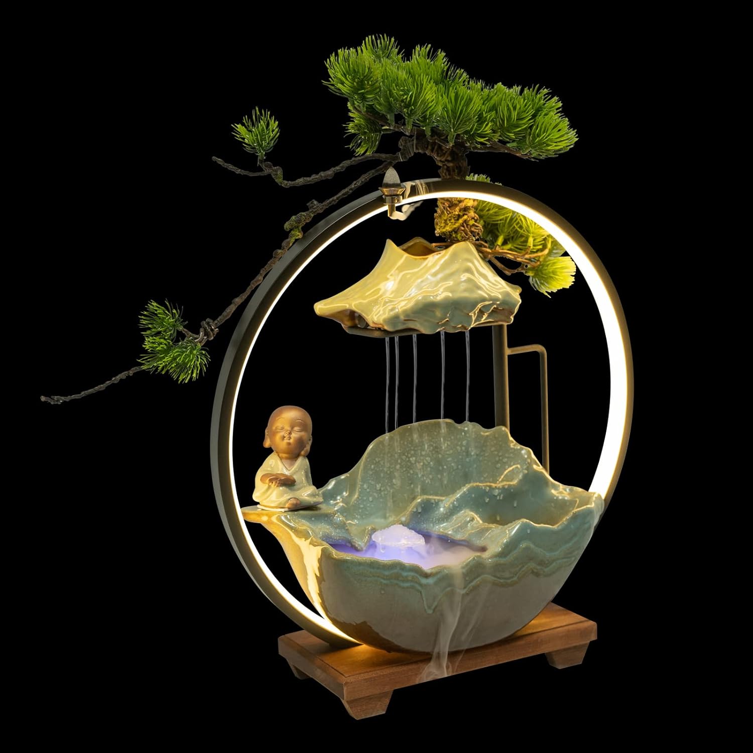 DescriptionA good ornament can soothe our mood and soul, and give us emotional sustenance. Made of exquisite ceramic and wood, and adopting an exquisite glaze firing process, this tabletop water fountain can be used for a long time. A beautiful appearance and lifelike images can add color to your room. It is not only a decoration but also a quiet and leisurely way of life.DetailsSolid Base: The large base(15.7*4.7inch) increases the stress area, so it can well maintain the stability of the product. It also raises the bottom to avoid moisture and facilitate cleaning.Long Cord: The 3.94ft cords allow you to have enough disposable length at your disposal for easy placement and further protect your safety.Convenient Hole: The hole at the top of the lamp loop can also allow you to place the backflow fragrance, which can not only clean the air but also help you sleep better.Practical Pump: The pump can achieve a sustainable circulating water supply, making the water safer, cleaner, and algae-free.ApplicationThis item can be widely used in the living room, bedroom, entrance, hallway, TV cabinet, study, office, meditation room, yoga room, hotel, cubicle, cashier, club, nursery, club, bank, and library to improve dry air, create beautiful scenery, and a relaxed peaceful atmosphere.How to Install1. Embed the LED light loop into the groove of the wood base, and press to make sure it is tightly fixed in the base.2. Place the reservoir stably on the base and make it stable, and put the water hose into the hole in the reservoir. 3. Place the switching device of the pump in the reservoir. Connect the water pump to the water hose, and put the mist maker in the ceramic bowl. 4. Pull the plug of the pump out of the reservoir.5. Place the water flow fixture steadily above the reservoir.6. Fix the Thuja slot on the shelf and fix it to the shape you like.7. Place the monk in a stable position on the fountain.SpecificationColor: GreenMaterial: Ceramic, WoodSurface Treatment: Glaze FiringAssembly Required: YesMounting Type: TabletopPlug Type: US StandardLight Source: LED Power Source: Corded ElectricIndoor/Outdoor Use: IndoorPower: 3WInput: AC 100-240V 50/60HzOutput: DC 24V 1ALength of Cord: About 1.2m/3.94ft Number of Items: 1Net Weight: 3.2kg/7.05lbsGross Weight: 3.5kg/7.72lbsOverall Size: 40*12*41.5cm/15.7*4.7*16.3inchPackage Size: 42*20*40cm/16.54*7.87*15.75inchPackage Included1*Tabletop Water Fountains1* LED Light Loop1* Pump1* Atomizer1* Power Cord1* Thuja1* MonkOther Accessories for InstallationNotes1. The product does not have incense and incense holder.2. Since the water pump, atomizer, and LED light all require a power supply, this product requires 3 outlets to fully operate, and please make sure you have enough outlets. The three plugs do not need to be opened at the same time, and you can choose according to your own needs.3. Please note that other plants cannot be grown on this product, and stones and real plants are not included.4. Please allow the slight color difference caused by the shooting light and 1-3 cm error due to manual measurement, and make sure you do not mind before ordering.